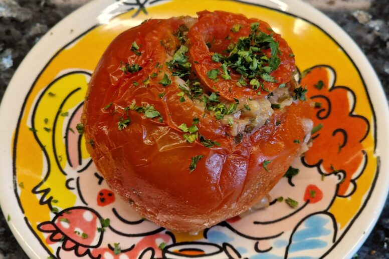 Hier werden Tomaten mit einem Risottorezept kombiniert. Tomaten entstielen und den Tomatendeckel samt Stielansatz erhalten. Fruchtfleisch aus dem Inneren der Tomate herausschaben, dabei die äußere Schale intakt lassen. Ein scharfer …