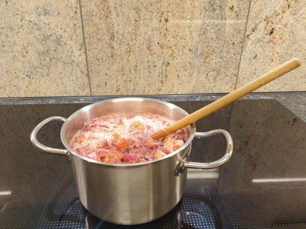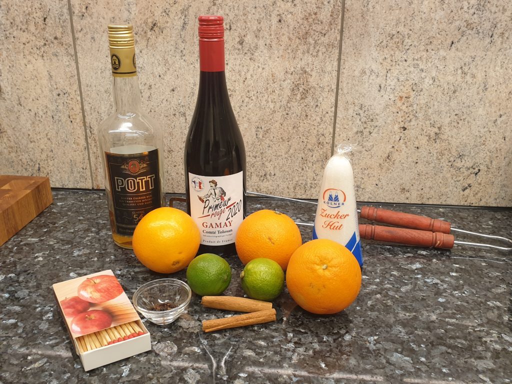Orangen und Limetten schälen und in kleine Stücke schneiden und zusammen mit dem Wein und den Gewürzen in einen Topf geben und erwärmen.