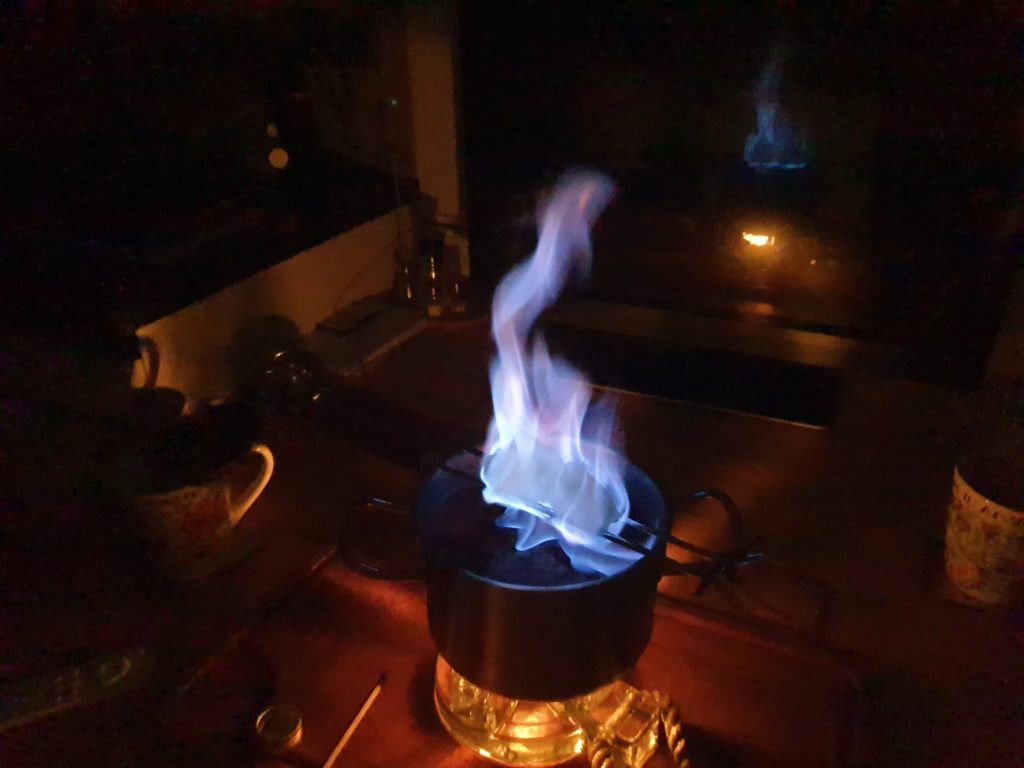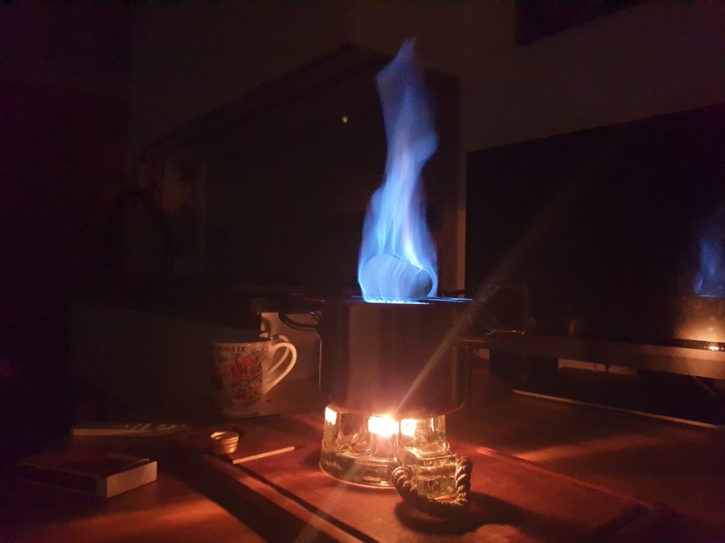 Rechaud anzünden und den Topf darauf stellen. Den Zuckerhut auf die Feuerzange auflegen und mit Rum beträufeln, mit einem Streichholz entflammen. Wird die Flamme kleiner, Rum mit einer Schöpfkelle nachgießen. Die blaue Flamme über Zuckerhut und Feuerzangenbowle lassen sich am Besten im Dunkeln sehen.