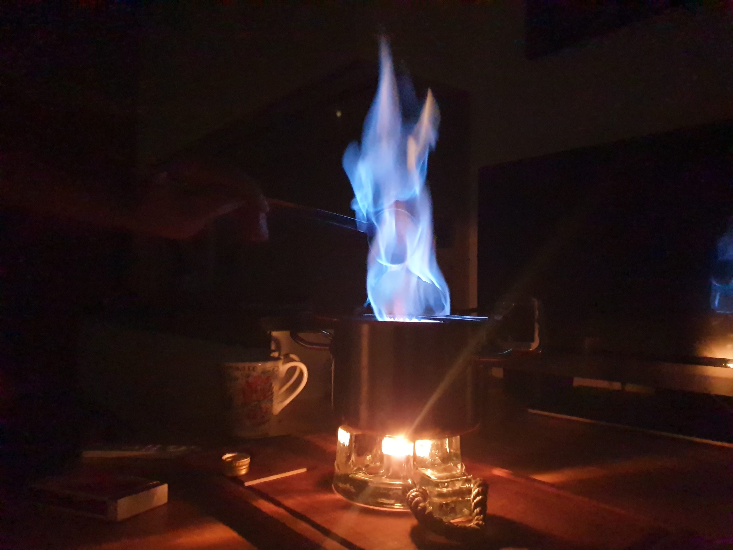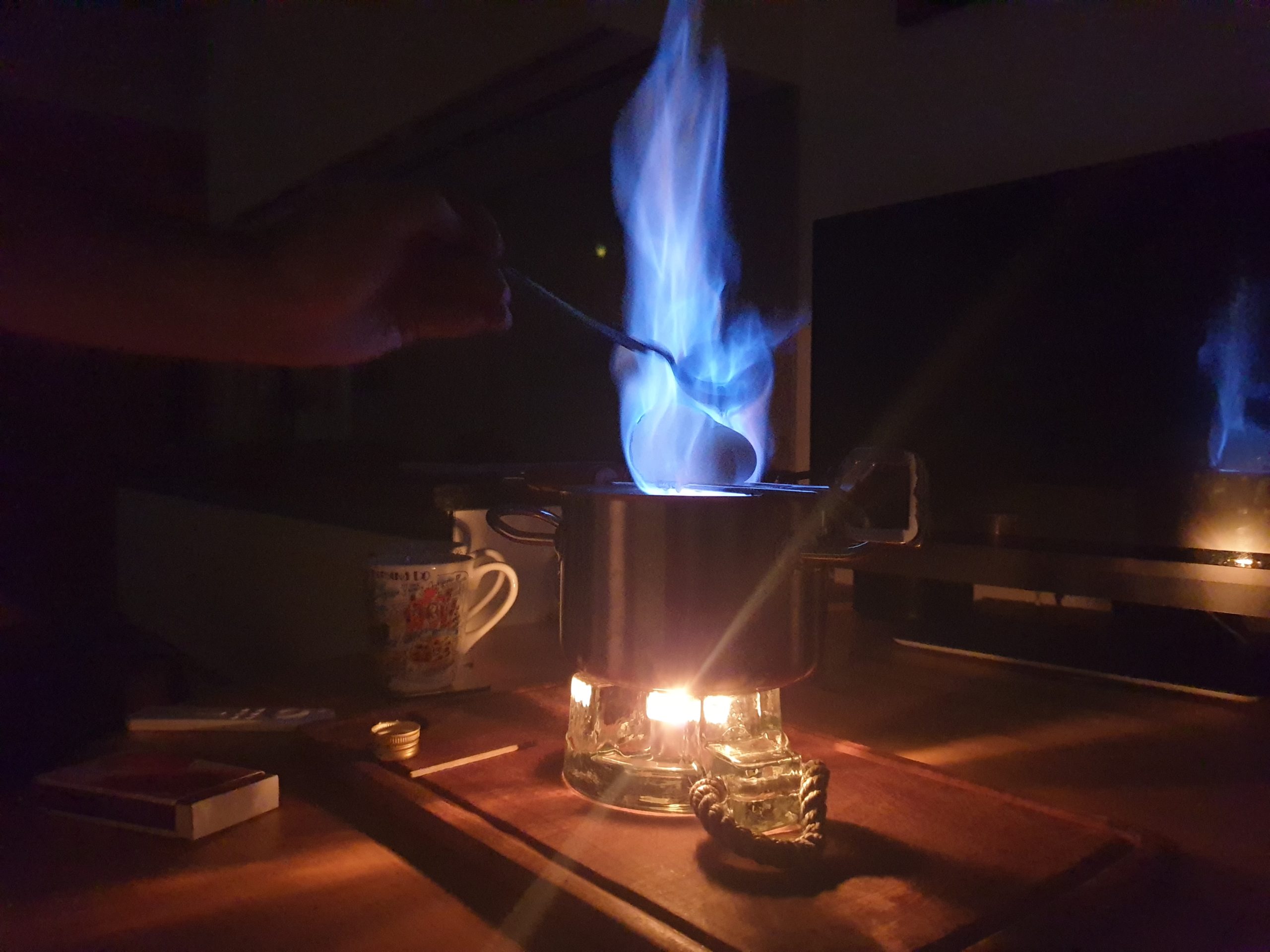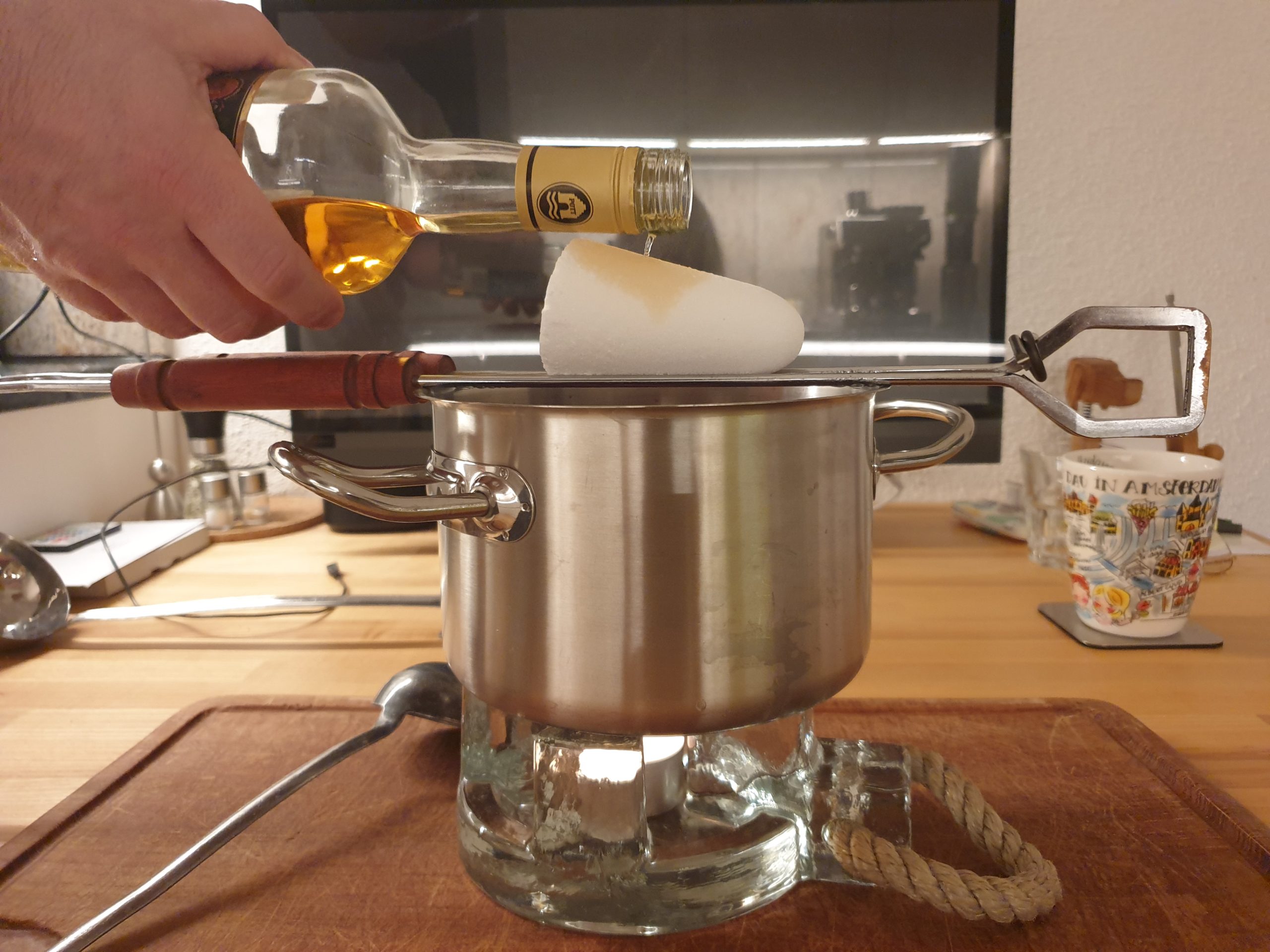 Rechaud anzünden und den Topf darauf stellen. Den Zuckerhut auf die Feuerzange auflegen und mit Rum beträufeln, mit einem Streichholz entflammen. Wird die Flamme kleiner, Rum mit einer Schöpfkelle nachgießen. Die blaue Flamme über Zuckerhut und Feuerzangenbowle lassen sich am Besten im Dunkeln sehen.