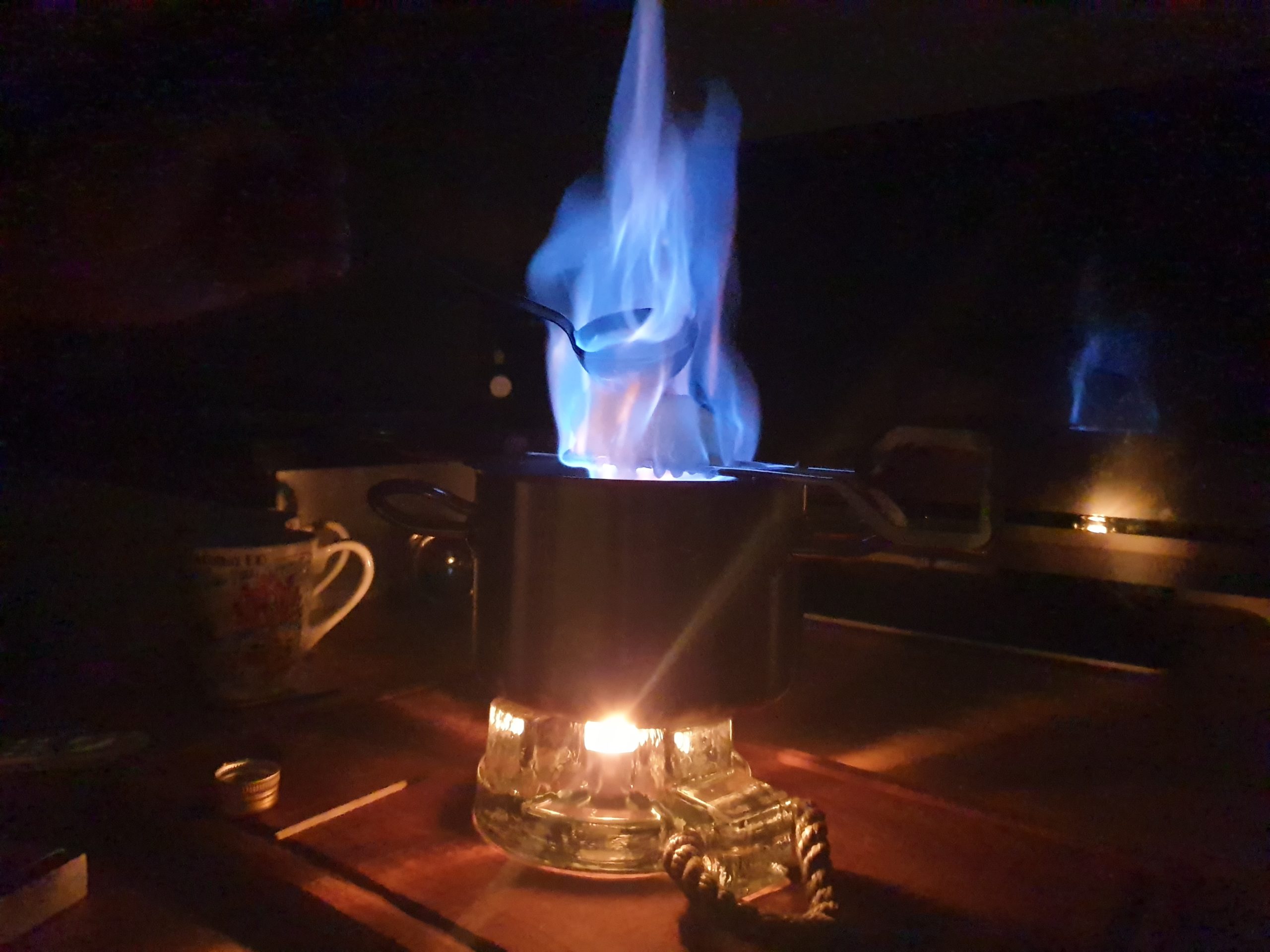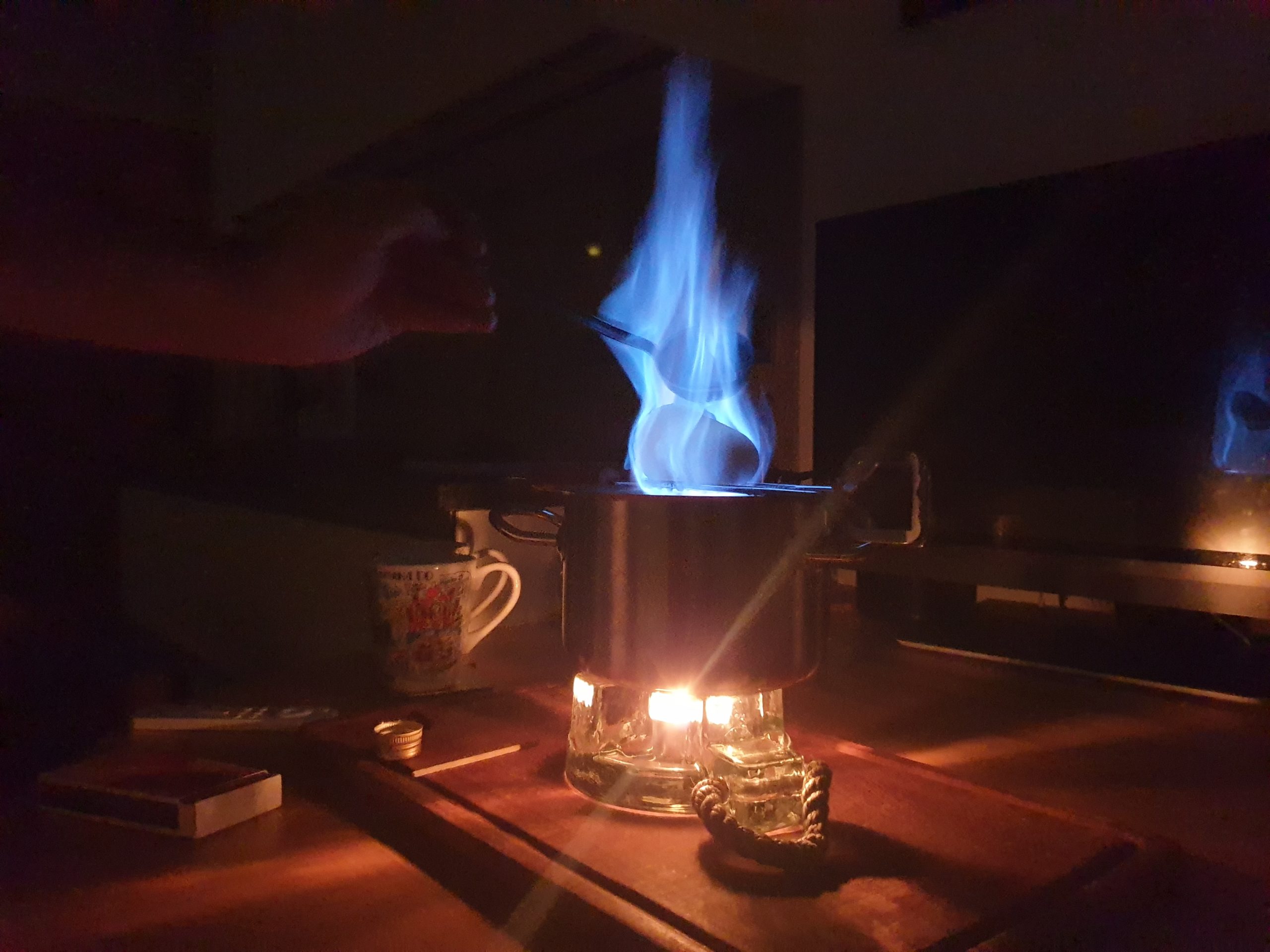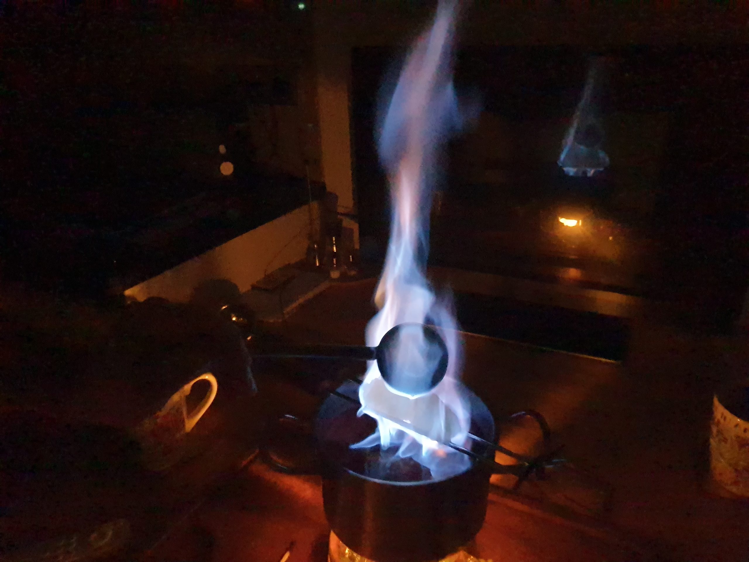 Rechaud anzünden und den Topf darauf stellen. Den Zuckerhut auf die Feuerzange auflegen und mit Rum beträufeln, mit einem Streichholz entflammen. Wird die Flamme kleiner, Rum mit einer Schöpfkelle nachgießen. Die blaue Flamme über Zuckerhut und Feuerzangenbowle lassen sich am Besten im Dunkeln sehen.