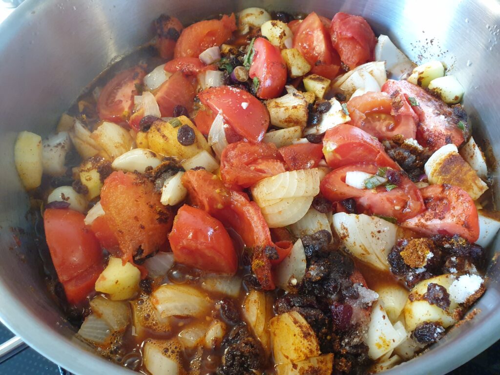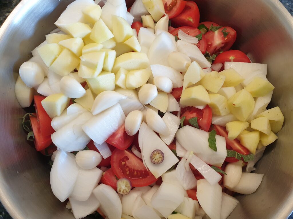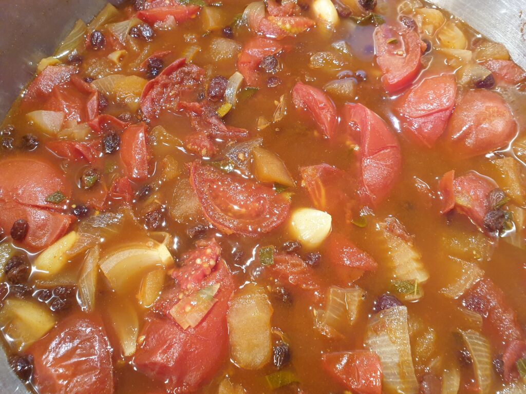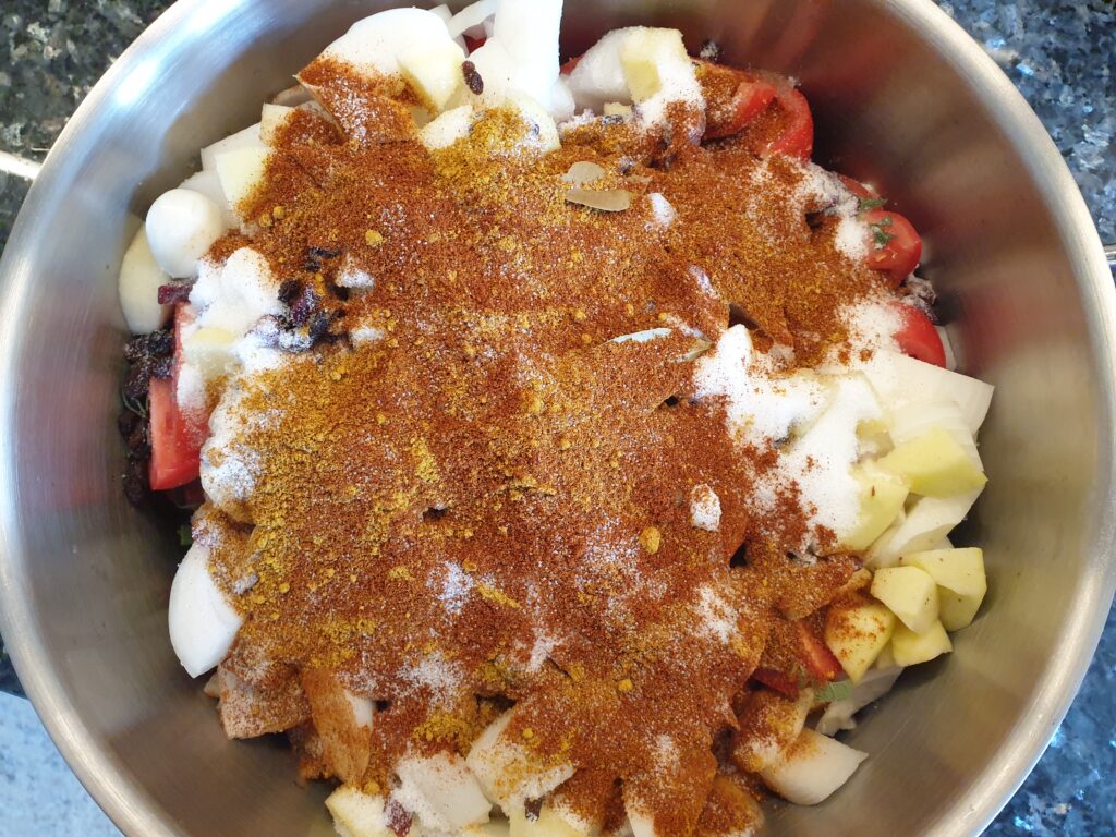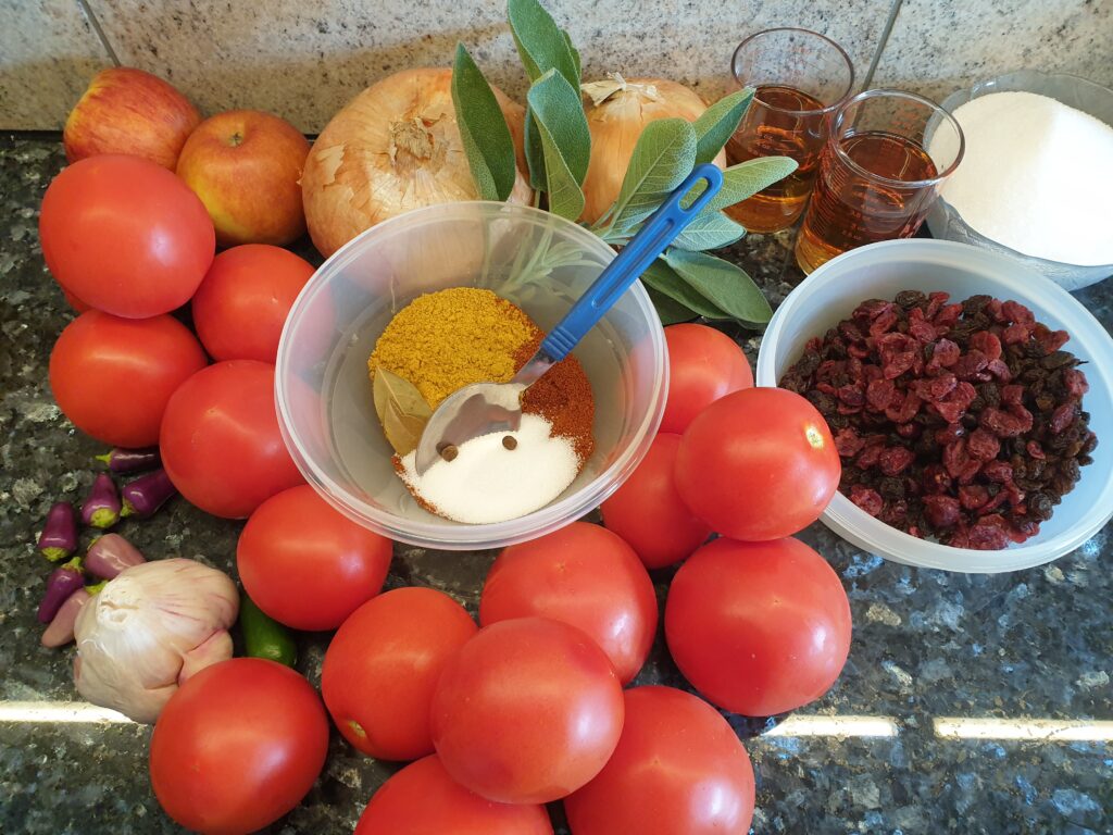 Gewaschene Tomaten, geschälte Zwiebeln und Äpfel vierteln und in einen Topf geben. Dazu kommen die Rosinen mit Zucker, Salz und Essig und allen Gewürzen. Gut durchrühren und 1,5 Stunden ohne Deckel leicht köcheln lassen (geht auch im Backofen 180°C Heißluft). Im Blender sehr fein zerkleinern. Ist die Masse zu flüssig, kann noch einmal eingekocht werden. Die Masse wird in mit kochendem Wasser gespülte Gläser gegeben und schnell mit ebenso behandelten Deckeln verschlossen. Gläser kurz stürzen, um sie dicht zu verschließen, und dann abkühlen lassen.