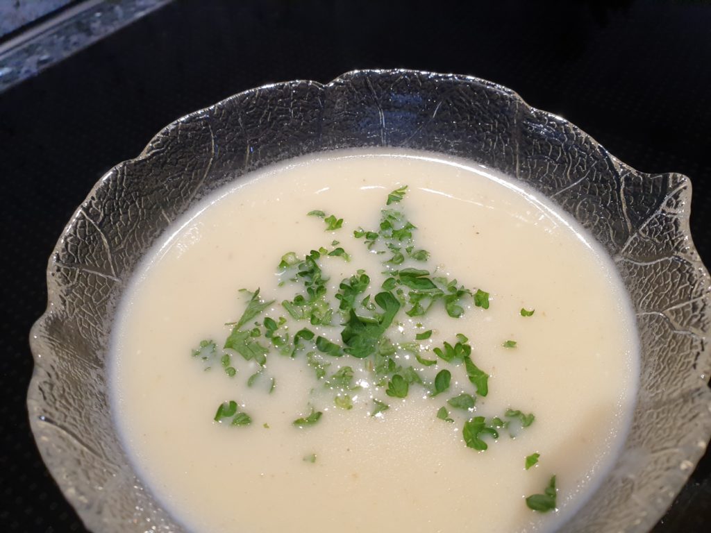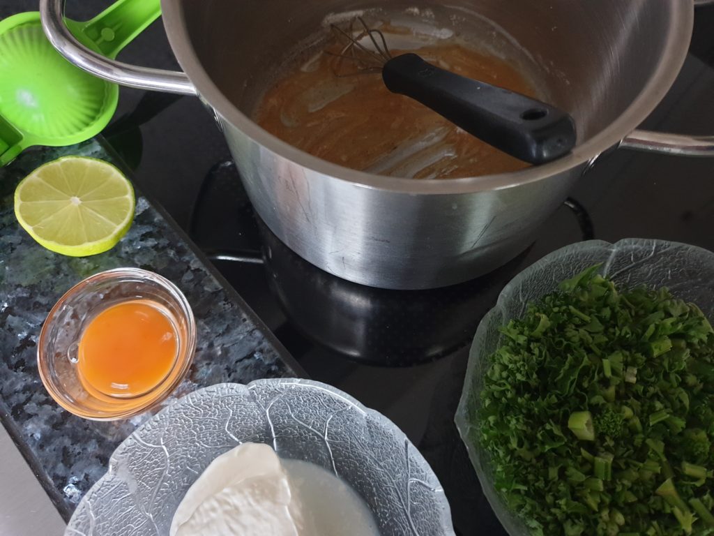 Nun Butter erhitzen und eine helle Mehlschwitze mit der Sahne erstellen. Den Spargelsud unter ständigem Rühren hinzugeben, damit die Flüssigkeit nicht klumpt, und kurz leise köcheln lassen. Salz, Pfeffer, Weißwein oder Limettensaft (Vorsicht, nur einen kleinen Schuss!) hinzugeben und ein letztes Mal kurz aufkochen lassen. Etwas abkühlen lassen und nun erst das Eigelb zufügen (TIPP: Immer frische, qualitativ hochwertige Eier verwenden), damit es in der Hitze nicht gerinnt. Zum Schluss mit geriebener Muskatnuss abschmecken. Nun die Spargelstücke hinzu geben, mit Kräutern oder/und Baconstückchen bestreuen und servieren.