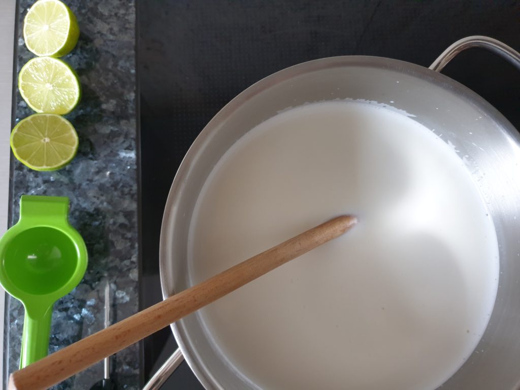 Für Paneer 2 L Milch unter ständigem Rühren in einem Topf aufkochen lassen, manche Rezepte regen an optional 200 ml Sahne zuzugeben. Milch von der Kochstelle nehmen und sofort den Saft von 1-3 Limetten hinein geben, bis die Milch sichtbar koaguliert und Molkebildung erkennbar ist.