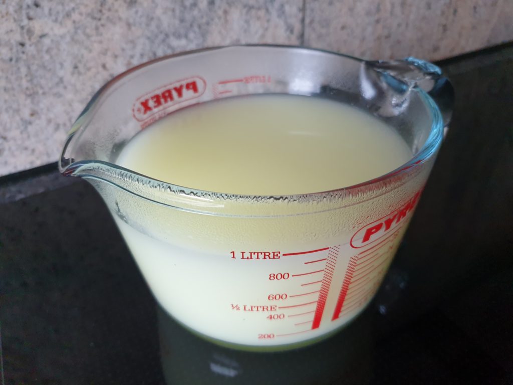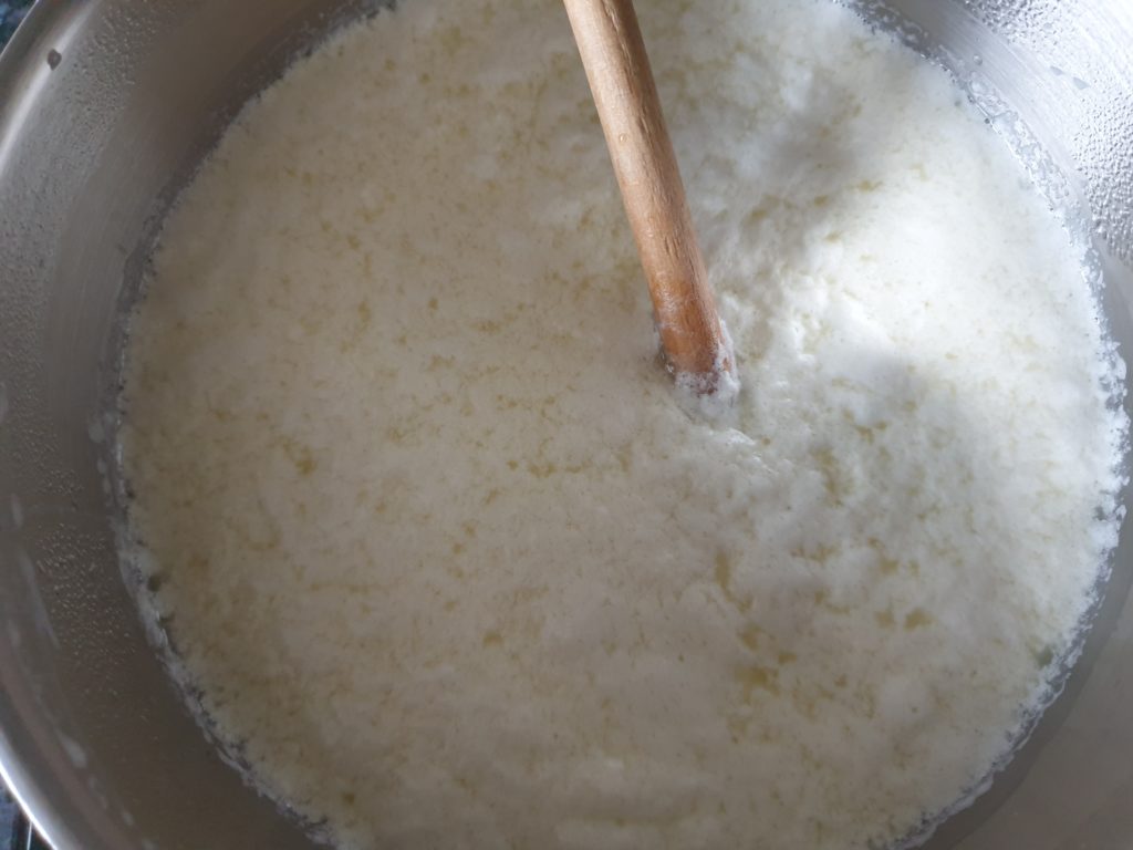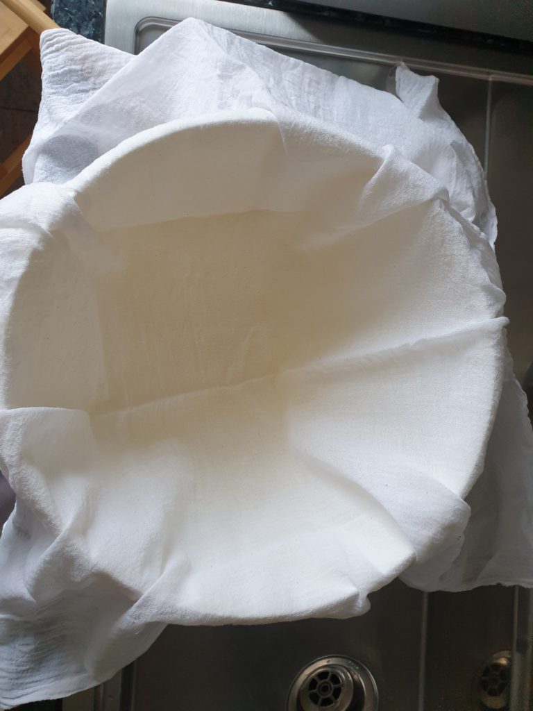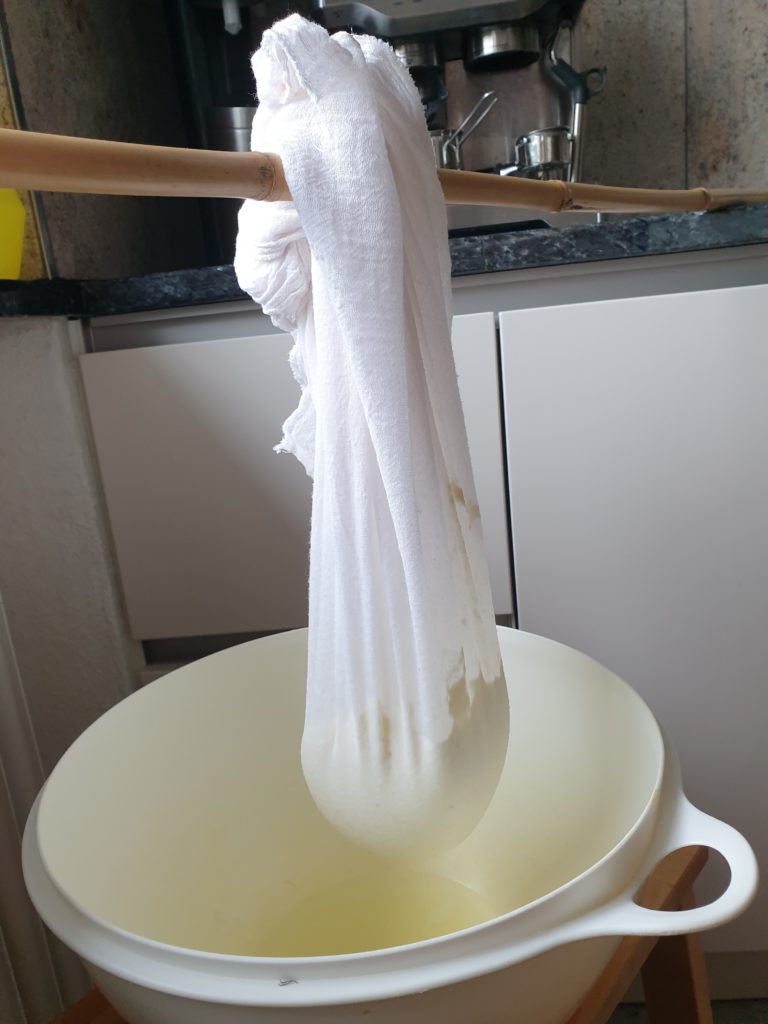 • gegebenenfalls 1 Esslöffel Essig um die Koagulation zu beschleunigen, danach aber den Käse im Käsetuch noch mit Wasser spülen um den Essiggeruch zu entfernen.