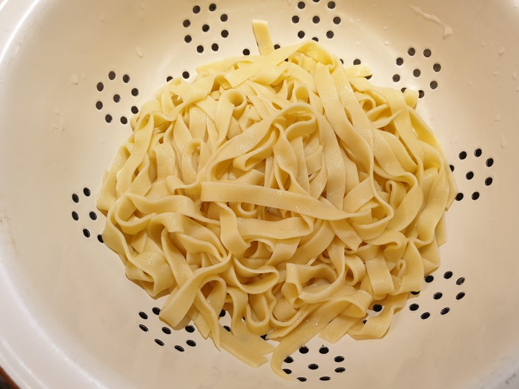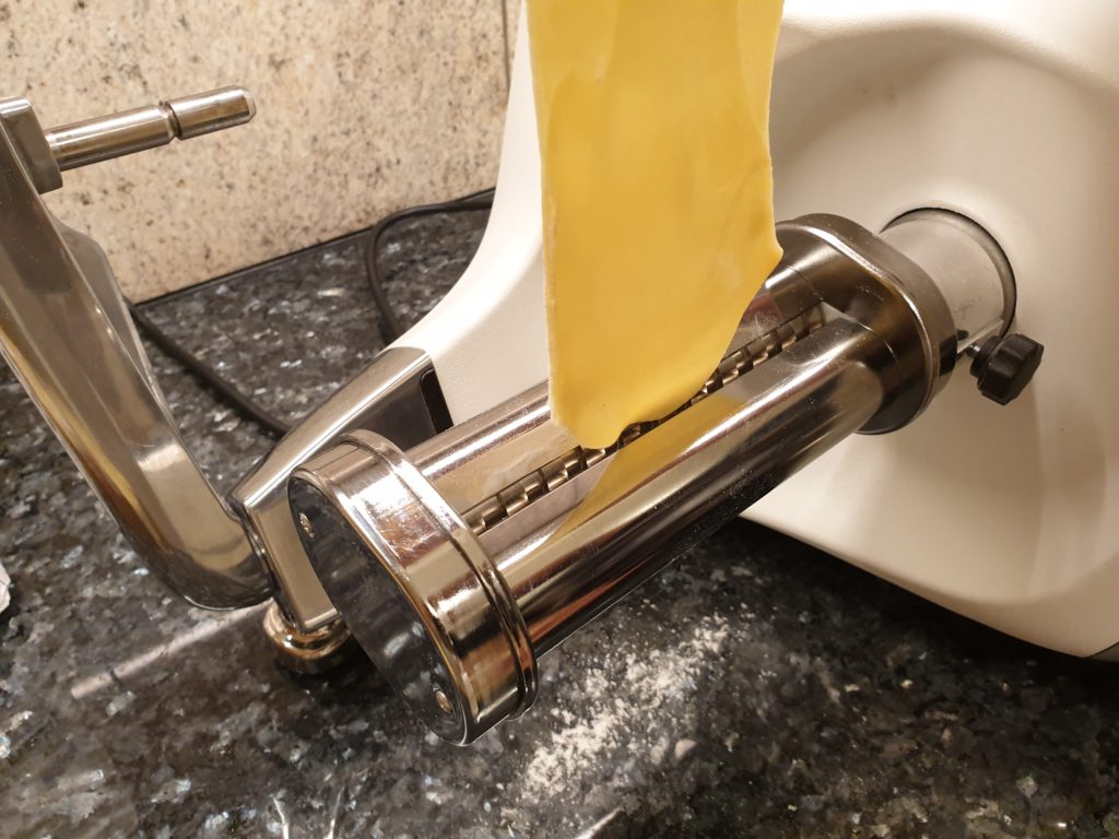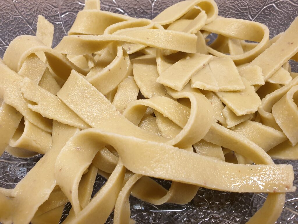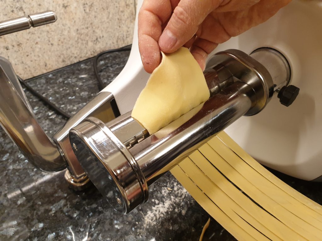 Im Anschluss dünn ausrollen und Bandnudeln mit Maschine oder von Hand schneiden.