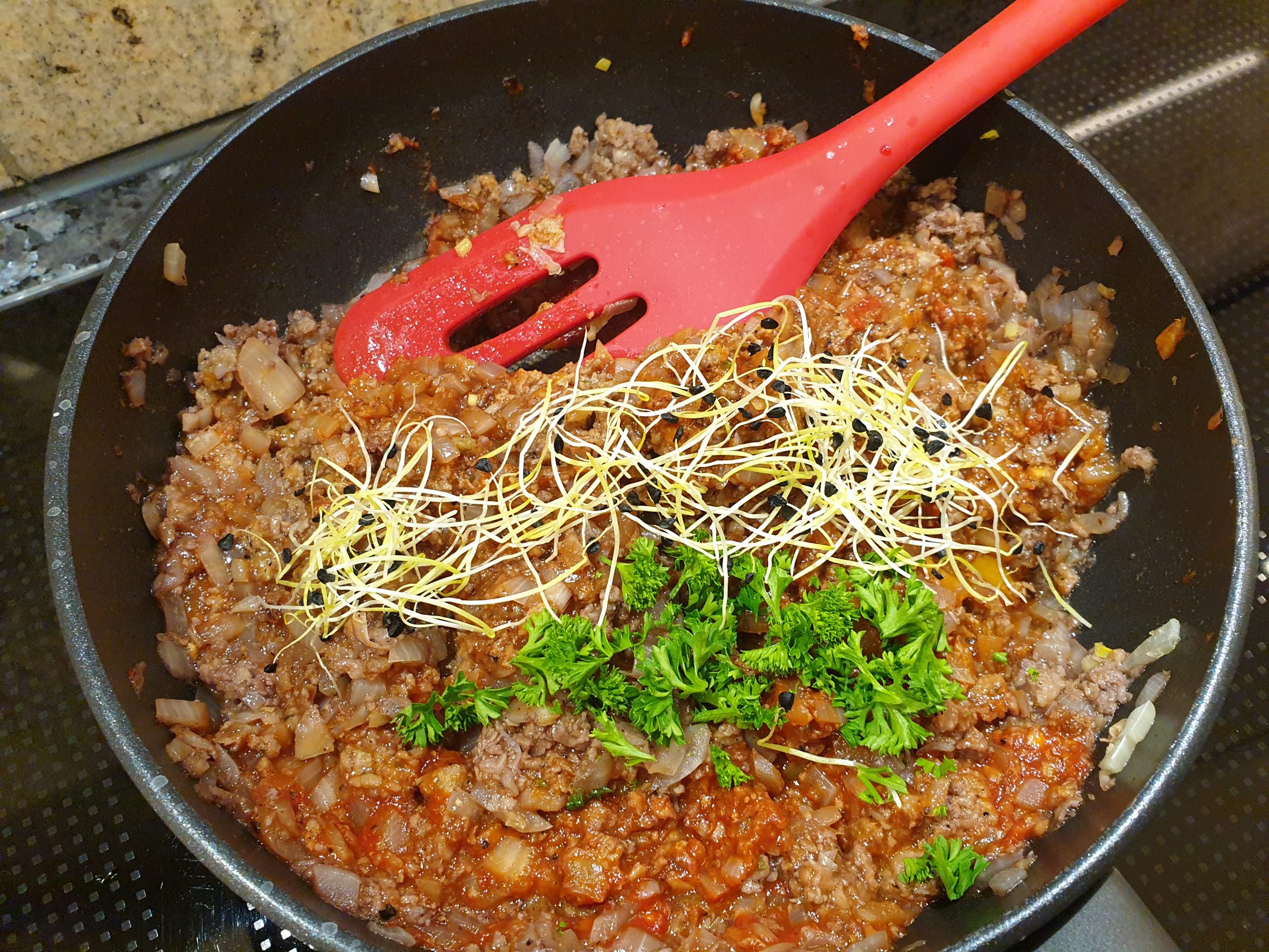 Dazu passen übrig gebliebene Frikadellen als Gehacktes und Tomatensauce (siehe Rezept Frikadellen) oder eine Käsesauce, sowie grüner Salat mit Joghurtsauce (siehe Rezept). Wer mag, kann das Ganze mit geriebenem Parmesankäse bestreuen. Guten Appetit!