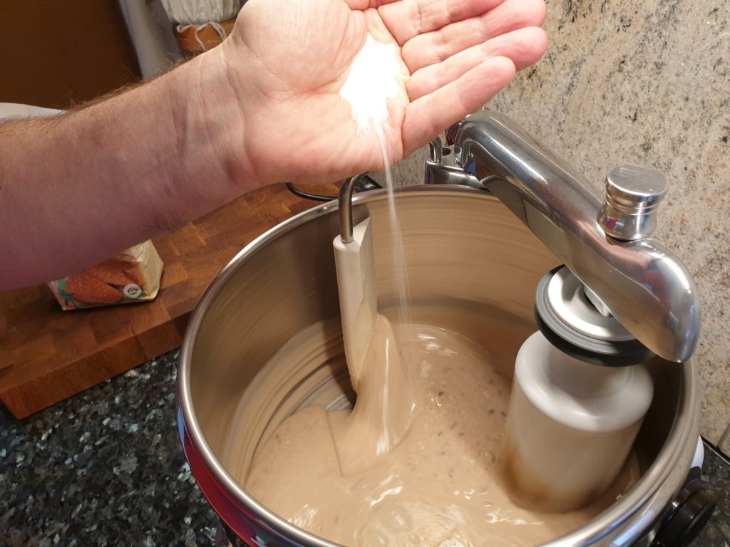 Zutaten nacheinander in die Rührmaschine geben, gleichmäßige Teigmasse herstellen. Sollte der Teig zu fest werden, etwas lauwarmes Wasser zugeben. Gewürze zugeben und untermischen. Im Backofen bei 30°C oder an einem warmen Ort bedeckt mit einem feuchten Handtuch gehen lassen, bis sich der Teig etwa verdoppelt hat.