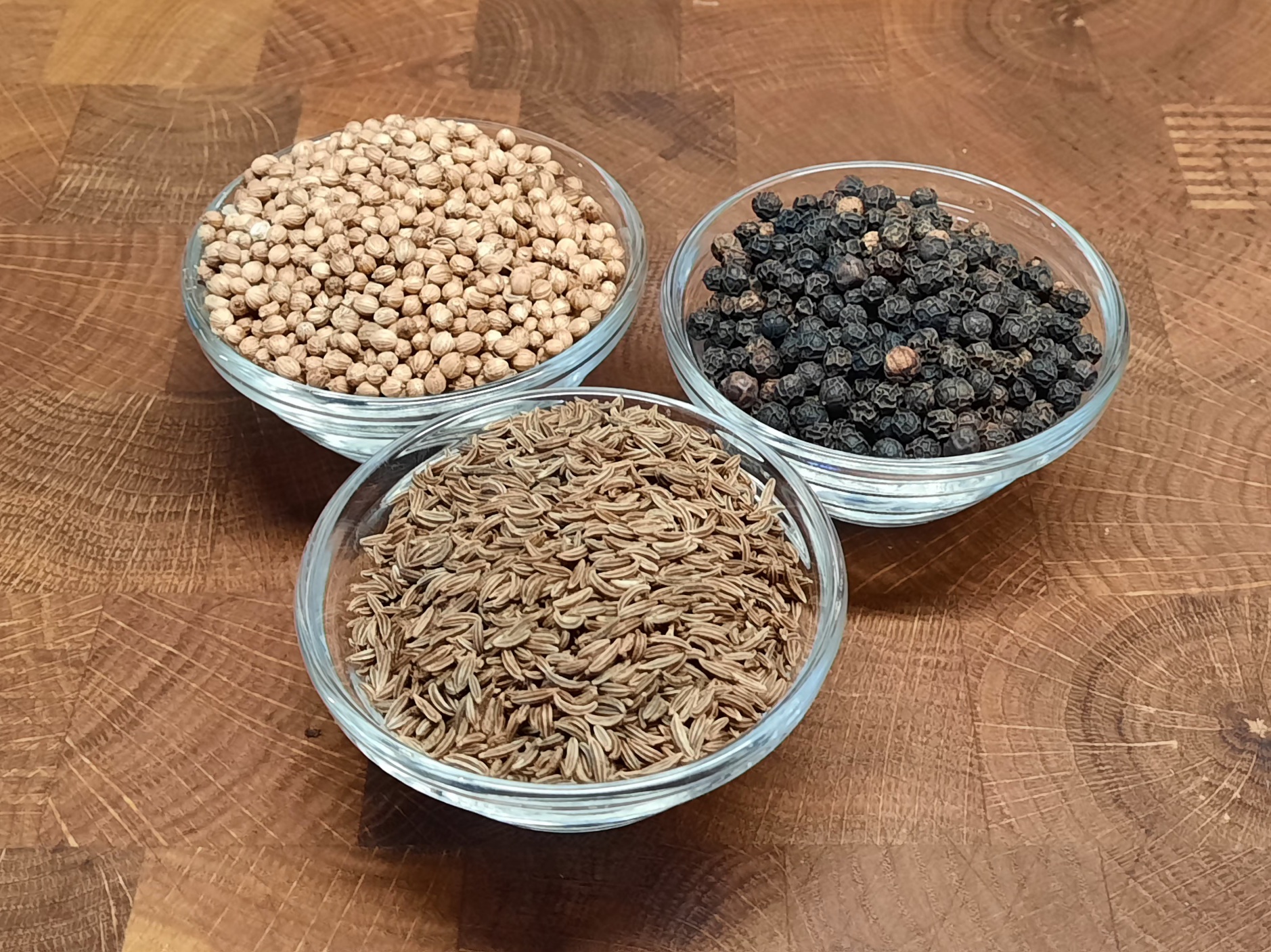 - Gewürze nach Belieben (z.B. je 2 EL Pfeffer, Koriander, Kümmel), frisch gemahlen