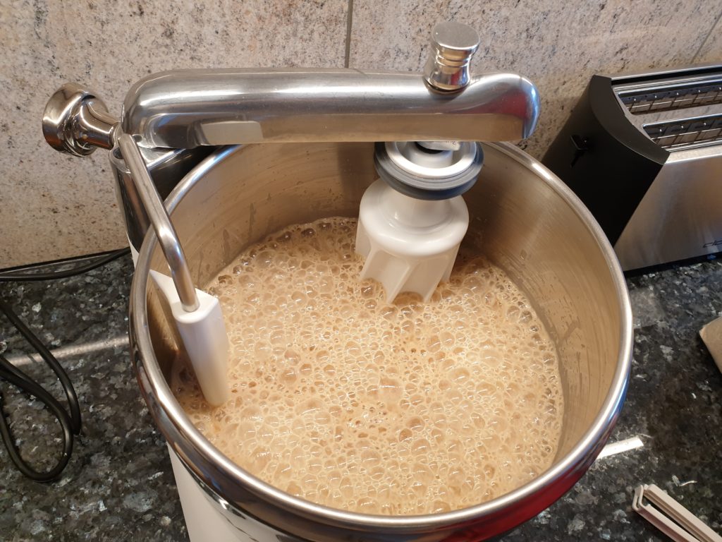 Zunächst wecken wir die Hefe: Die Flüssigkeit und Zutaten gleichmäßig in der Maschine verrühren, gehen lassen, bis der Vorteig Blasen wirft und im Gefäß aufgeht. (ca. 15 min.).