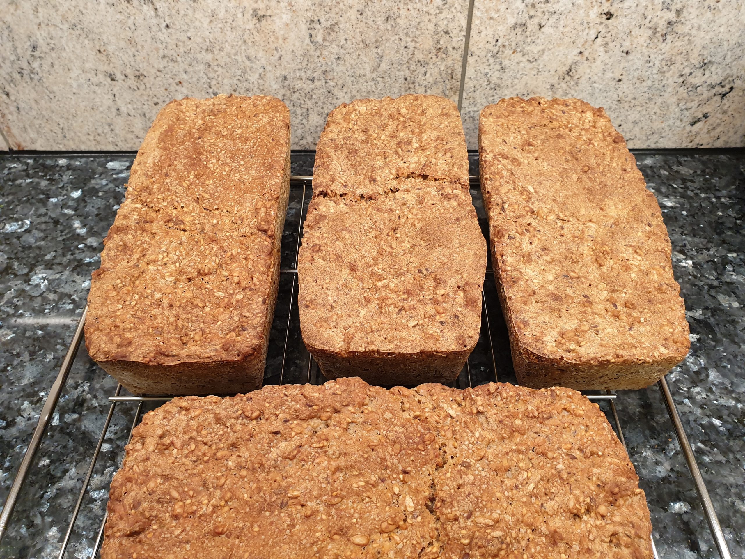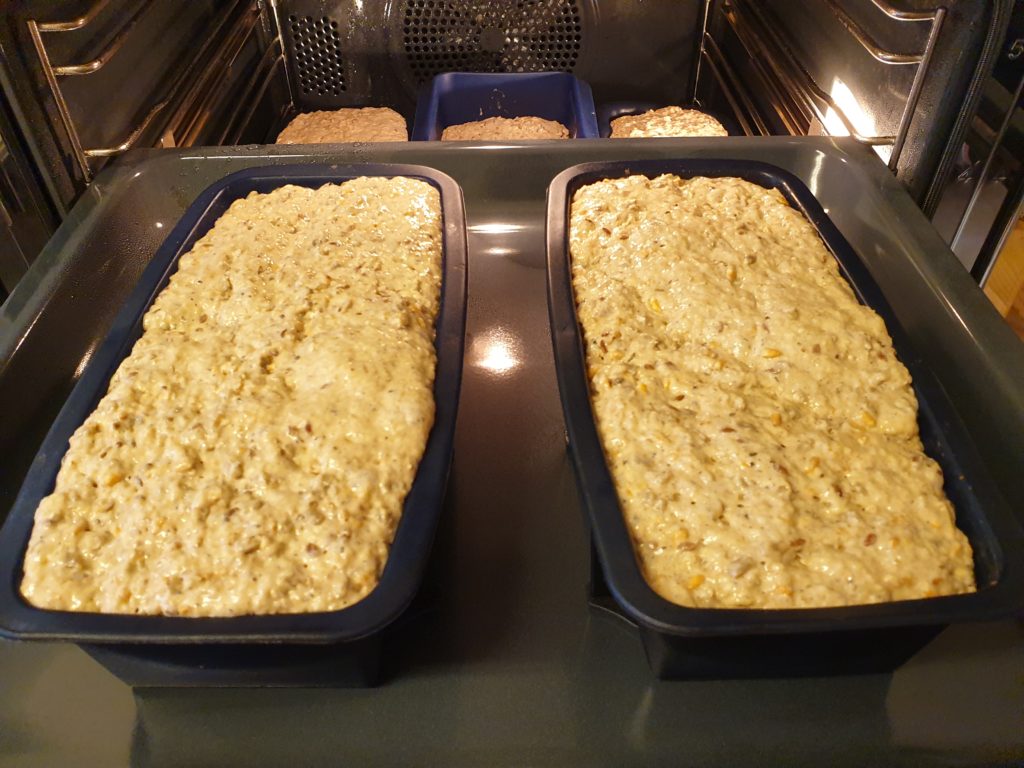 Noch einmal durchrühren und in Backformen füllen oder zu Broten oder Brötchen formen, je nach Belieben und Konsistenz des Teiges. Zum Gehen noch einmal bei 30-35°C für 45 min. in den Ofen geben, dabei feucht halten wie oben beschrieben. Dann Ofen hochheizen auf 220°C. Nach Erreichen der Temperatur für zunächst 10 min. backen, dann Temperatur auf 180°C herunter regeln und weitere 40 min. backen. Guten Appetit!
