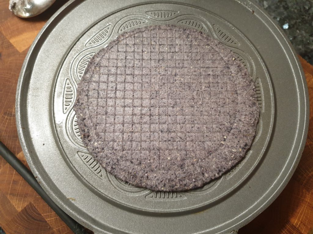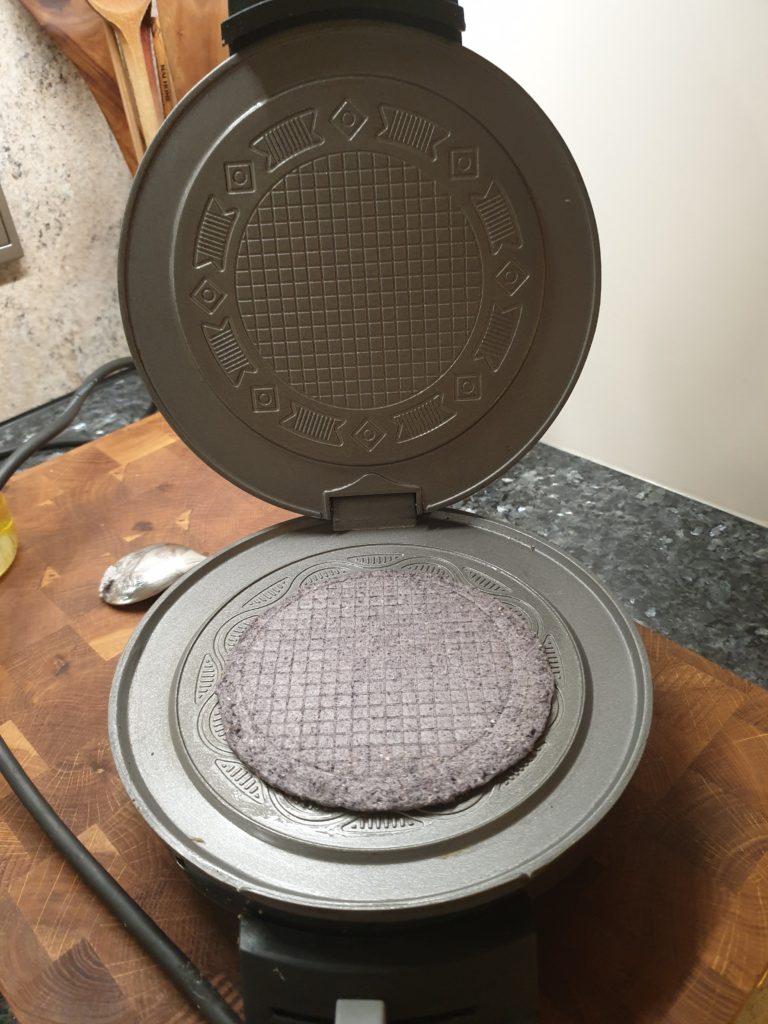 Maismehle und Wasser zu einem zähen Brei anrühren. Neujahrskucheneisen vorheizen und mit zwei Esslöffeln ein Häufchen der Teigmasse auf das Eisen geben. Eisen schließen und backen, bis das Gerät den Abschluss meldet. Gerät öffnen und Tortilla entnehmen. Diese tragen jetzt das hübsche Muster des Kucheneisens. Die Tortilla können eher weich oder härter hergestellt werden, je nach eingestellter Backzeit des Waffeleisens.