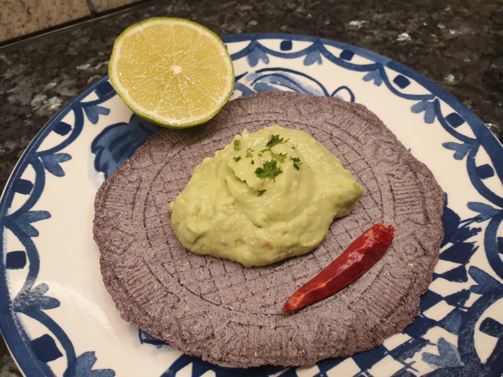 Die Tortilla schmecken gut mit etwas Limettensaft bestrichen und Avocado Dip belegt.