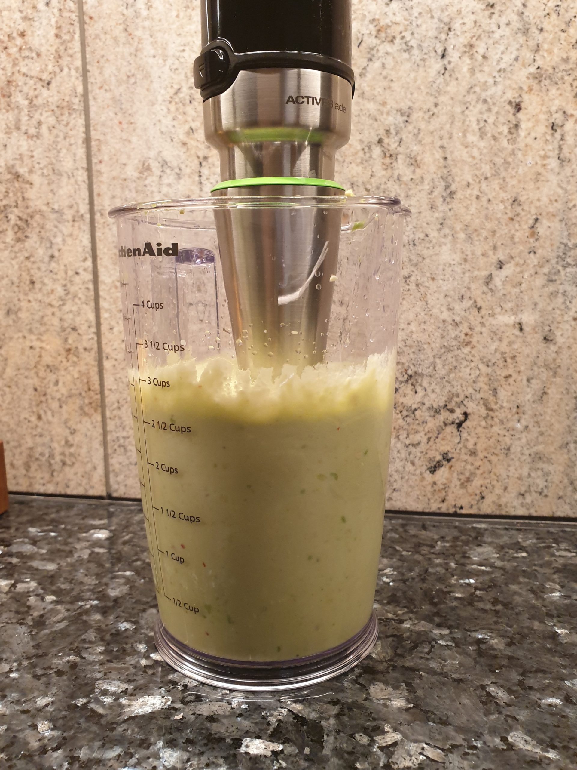Avocado mit Joghurt, Knoblauch, Ingwer und Chili in den Blender geben und zu einer glatten Masse verarbeiten. Tomaten und Lauch in eine Schüssel geben, mit der Avocadomasse übergießen und durchrühren. Dies ist ein sehr schnelles Rezept für warme Tage.