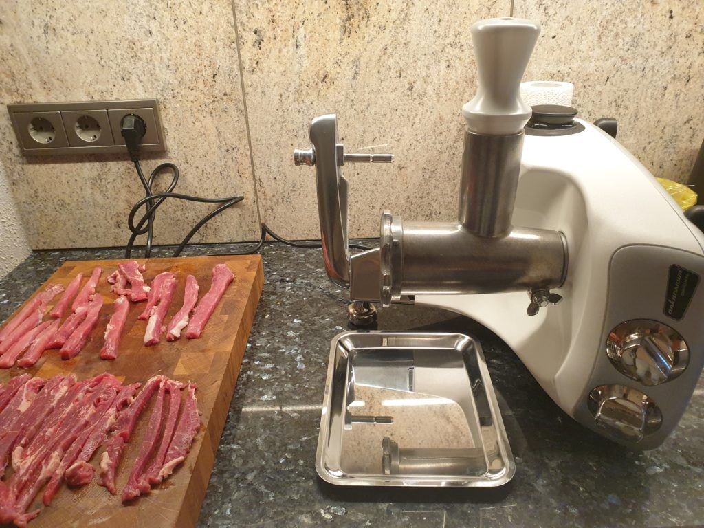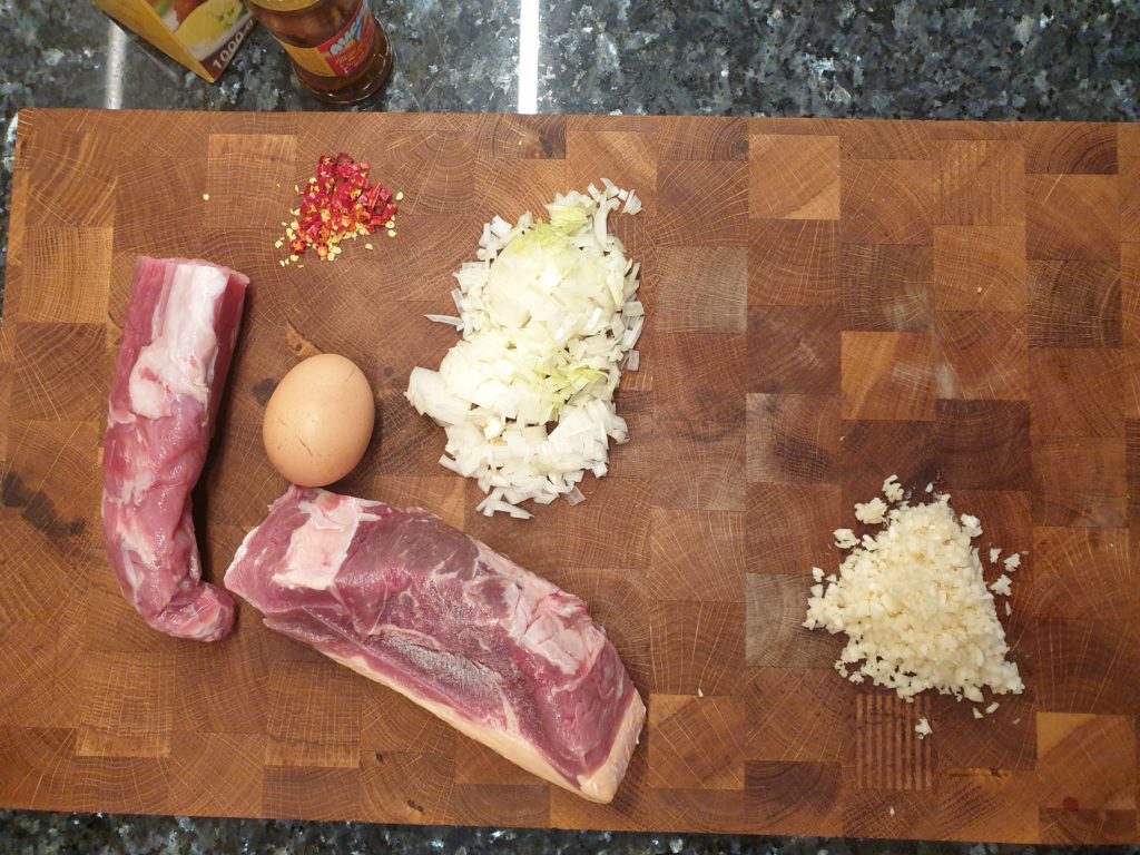 - 200 g Schweinefleisch, z.B. Sauenfilet – diverse Rassen (Duroc, usw.) beeinflussen das Ergebnis.