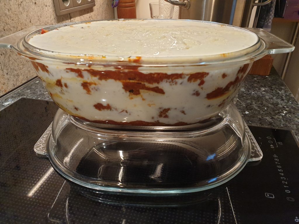 Nun die Saucen abwechselnd mit den Pasta-Platten in eine eingeölte feuerfeste Form geben, die letzte Schicht mit geriebenem Parmesan überdecken. Bei 180°C für etwa 30 Minuten im Ofen überbacken.