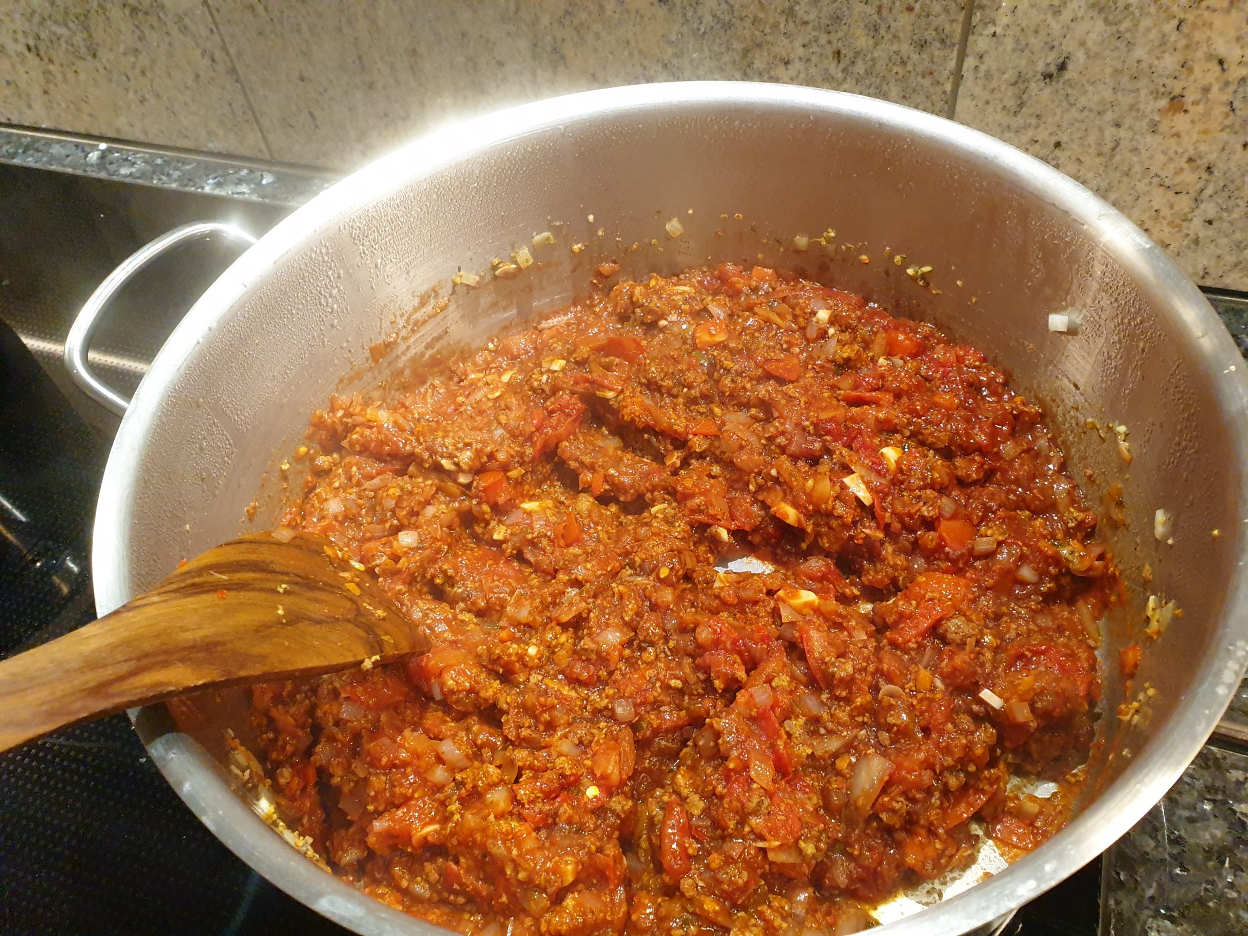 Für die Sauce das Gehackte anbraten. Paprika und Tomaten in Streifen schneiden. Paprika ohne Fett anschmoren, Tomaten, Zwiebel und Chilischote zugeben und köcheln lassen, gegebenenfalls mit Rotwein ablöschen. Zum Schluss mit Tomatenmark, Crème fraîche und etwas Salz abschmecken.