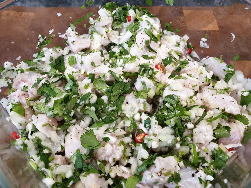 Zutaten in einem Glasgefäß mischen und mindestens 4 Stunden, besser noch über Nacht in den Kühlschrank stellen, das Fischfleisch wird mit dem Einwirken der Marinade weiß. Angerichtet wird zum Beispiel mit Scheibchen von Tomate oder Avocado, aber wir schlagen eine Kartoffel-Karotten oder Süßkartoffel Espuma vor, wie unten beschrieben. Guten Appetit!