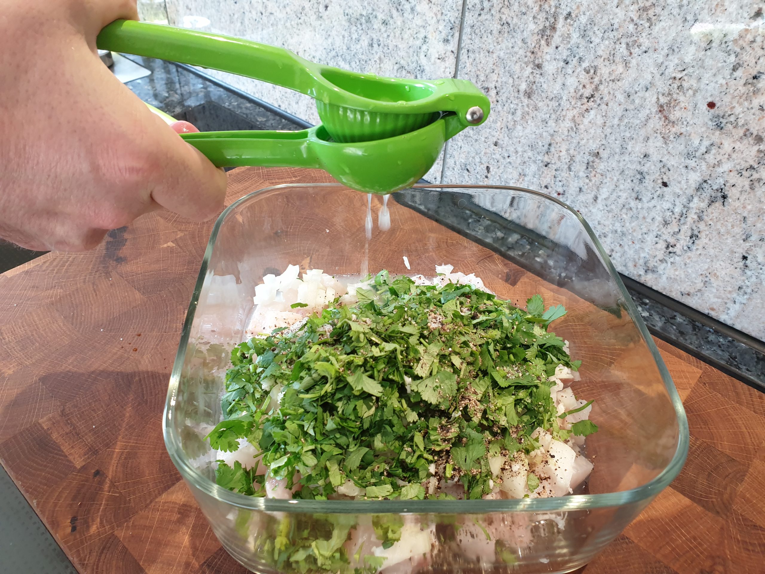 Zutaten in einem Glasgefäß mischen und mindestens 4 Stunden, besser noch über Nacht in den Kühlschrank stellen, das Fischfleisch wird mit dem Einwirken der Marinade weiß. Angerichtet wird zum Beispiel mit Scheibchen von Tomate oder Avocado, aber wir schlagen eine Kartoffel-Karotten oder Süßkartoffel Espuma vor, wie unten beschrieben. Guten Appetit!