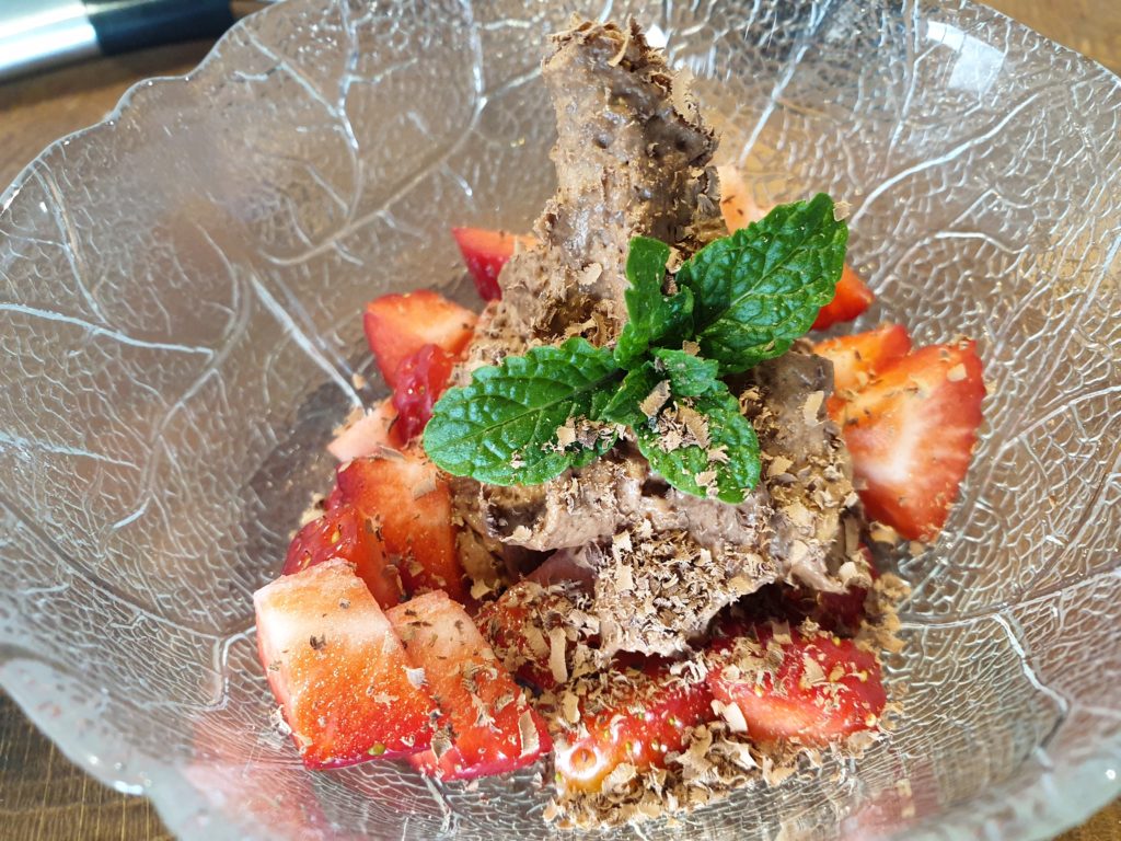 Sahne mit der Schokolade und den zerkleinerten frischen Minzblättern aufkochen, etwa eine Minute köcheln lassen. In ein enges Gefäß überführen und pürieren. Durch ein feines Sieb mit Trichter in den Sahnespender (ISI Gourmet) füllen und 30 Minuten kaltstellen. Den Aufsatz mit Kapsel auf den Sahnespender setzen und 15x schütteln. Erdbeeren waschen und in Stückchen anrichten, das Espuma darüber geben und mit Schokoladenraspeln aus Zartbitterschokolade bestreuen. Guten Appetit!