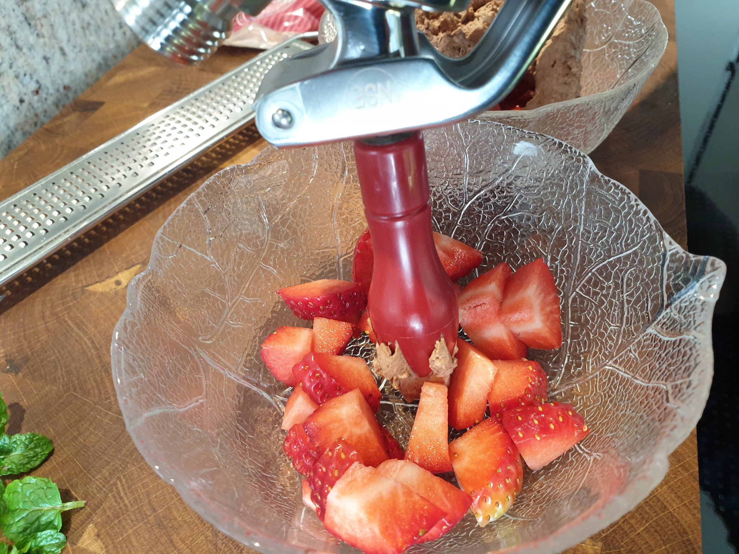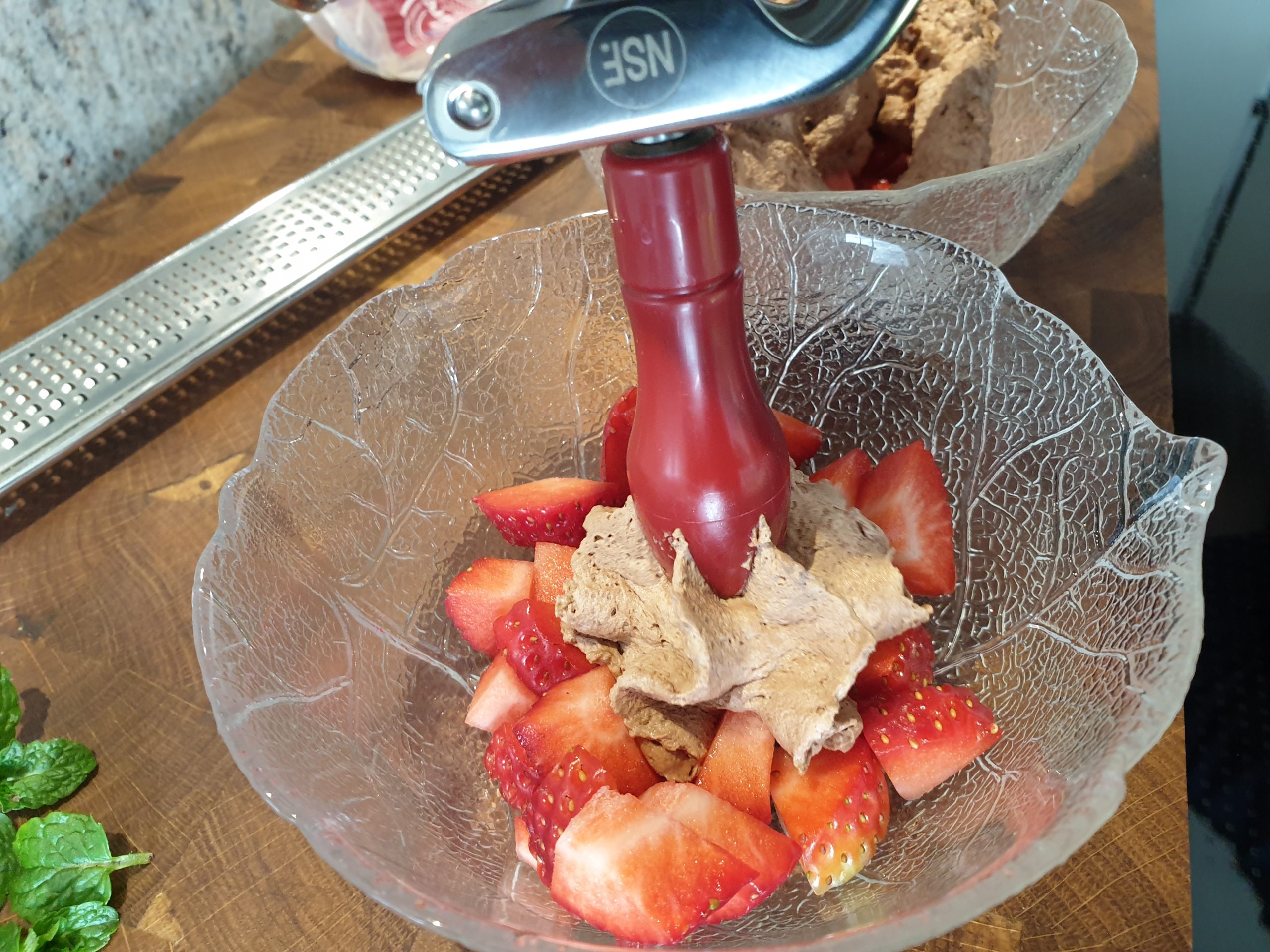 Sahne mit der Schokolade und den zerkleinerten frischen Minzblättern aufkochen, etwa eine Minute köcheln lassen. In ein enges Gefäß überführen und pürieren. Durch ein feines Sieb mit Trichter in den Sahnespender (ISI Gourmet) füllen und 30 Minuten kaltstellen. Den Aufsatz mit Kapsel auf den Sahnespender setzen und 15x schütteln. Erdbeeren waschen und in Stückchen anrichten, das Espuma darüber geben und mit Schokoladenraspeln aus Zartbitterschokolade bestreuen. Guten Appetit!