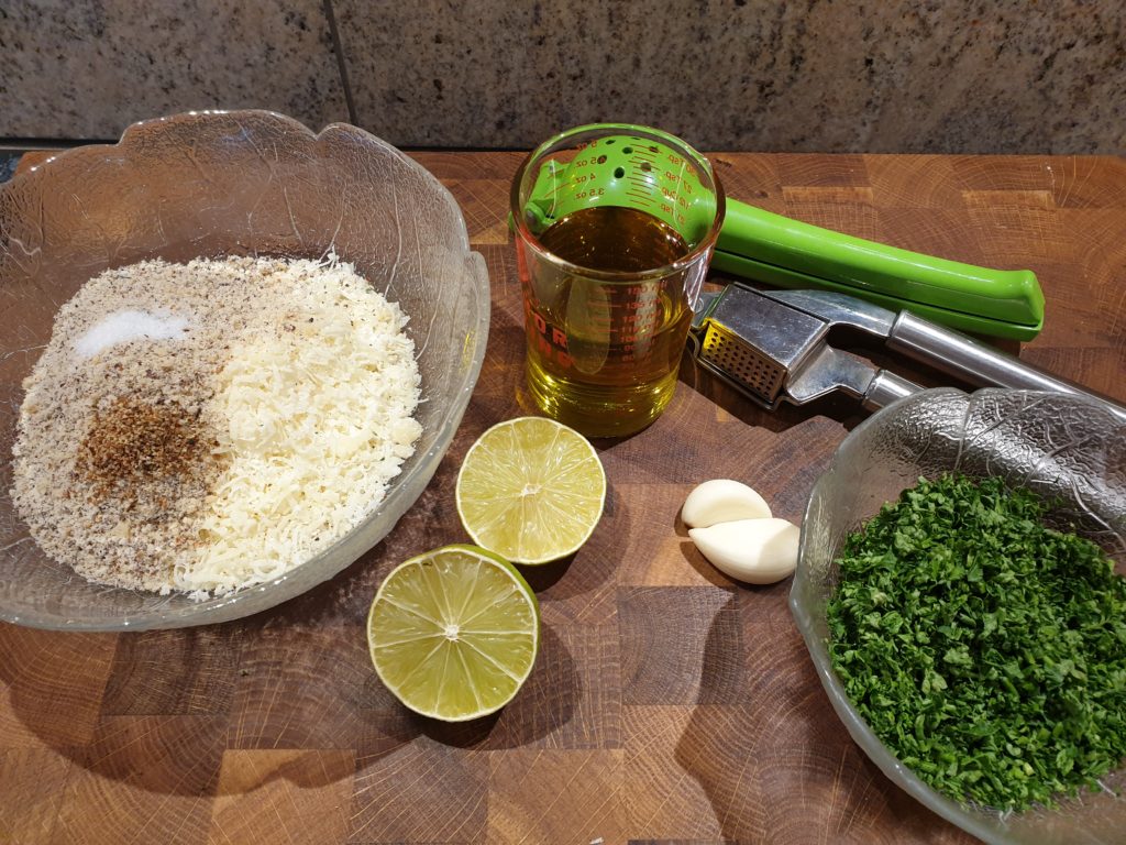 […] mit Salz und Pfeffer und einem Schuss Marsala abschmecken. Man kann zum Servieren selbst gemachtes Pesto (siehe Rezept) und gegebenenfalls mit etwas Limettensaft vermischt anbieten zusätzlich anbieten, es verstärkt […]