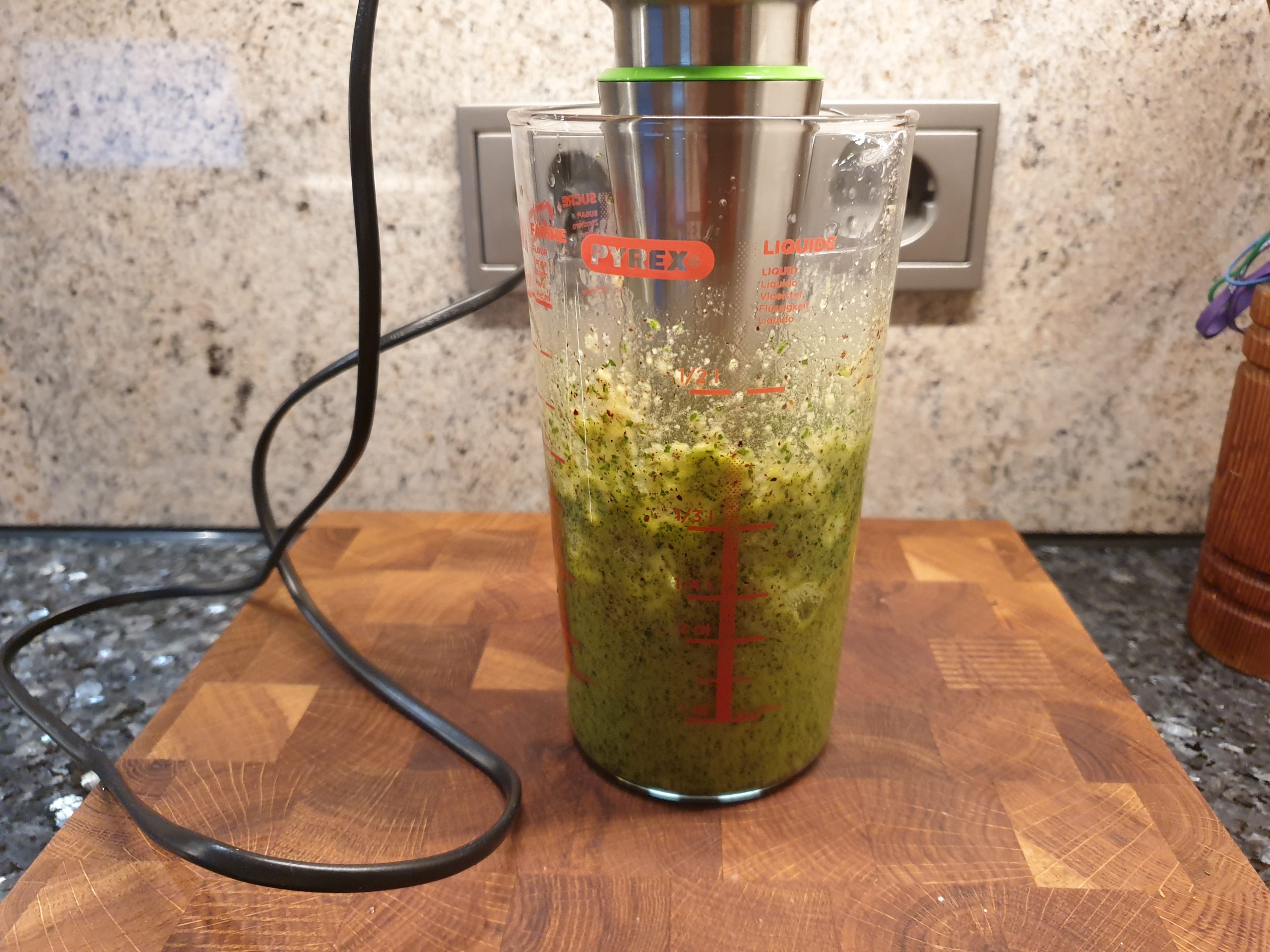 Alle Zutaten im Blender fein pürieren. Kalt abfüllen, ist im Kühlschrank etwas 4 Wochen haltbar. Wird das Pesto zu Nudeln serviert, kann es sich empfehlen, die Sauce mit 1-3 Esslöffeln des Nudelwassers und etwas Limettensaft zu versetzen. Das Pesto ist auch als kleine geschmackliche Addition zu diversen weiteren Gerichten empfehlenswert, wie zum Beispiel Tomatencarpaccio.