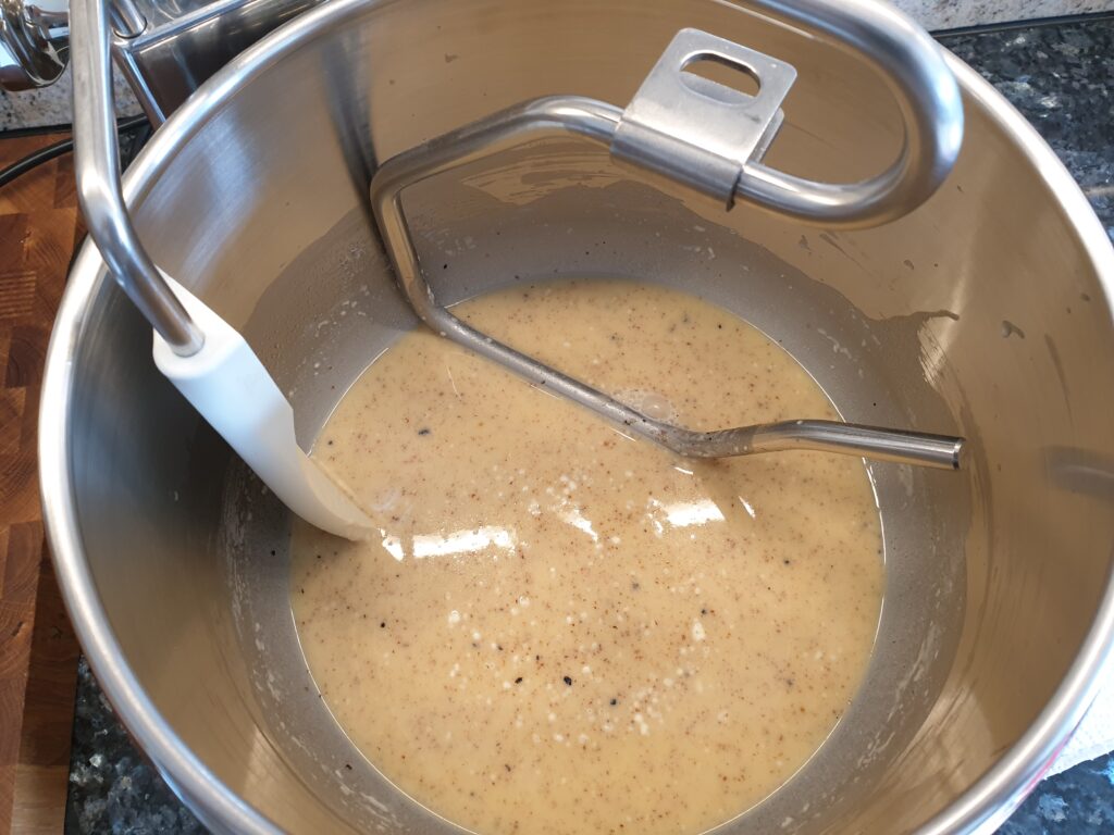 Milch mit der Butter handwarm erwärmen, mit der Hefe vermischen als Vorteig etwas gehen lassen bis er Blasen schlägt (etwa 15 Minuten), dann alle Zutaten mit Knethaken zu einem glatten Teig verarbeiten.
