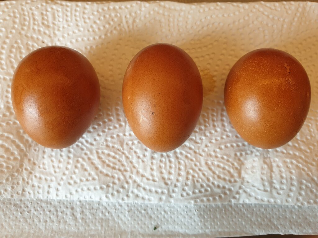 Die Eier zum Verzieren werden separat 10 Minuten gekocht und anschließend nach Färbeanweisung kräftig rot gefärbt, dazu reichen etwa 30 bis 60 Minuten im Färbebad. Nach dem Trocknen werden die Eier dünn mit Olivenöl bepinselt und mit einem Tuch glänzend gerieben, was sie auch haltbarer macht. Statt mit Lebensmittelfarbe kann auch mit Schalen von roten Zwiebeln mit einem Schuss Essig färben.