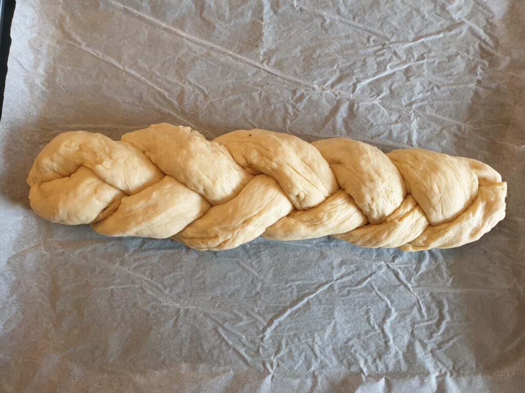 Den Zopf bei 160°C (Umluft) bis 170°C (Klimagaren mit Dampfstoß) etwa 35 bis 40 Minuten backen.