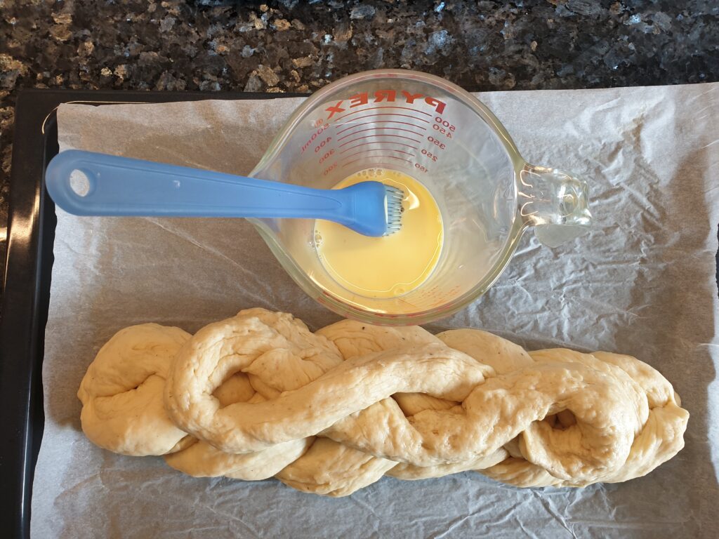 Den Zopf nun abgedeckt einem warmen Ort etwa 30 Minuten ein zweites Mahl gehen lassen. Vor dem Backen für den Glanz mit der Eigelb-Milch-Mischung bestreichen, dies in den letzten 5 Minuten wiederholen. Wer mag kann das Brot mit blättrig geschnittenen Mandeln oder Sesam bestreuen.