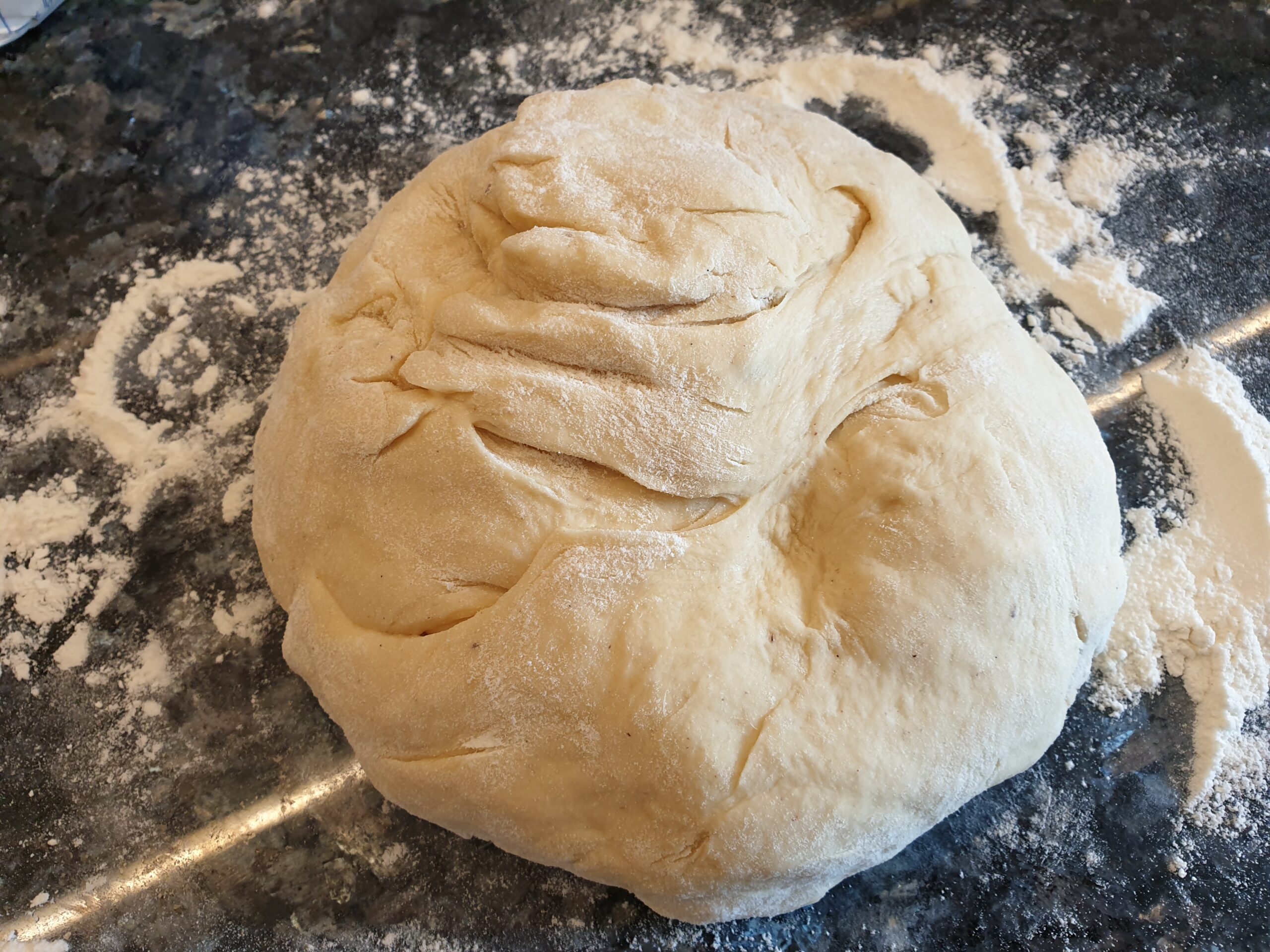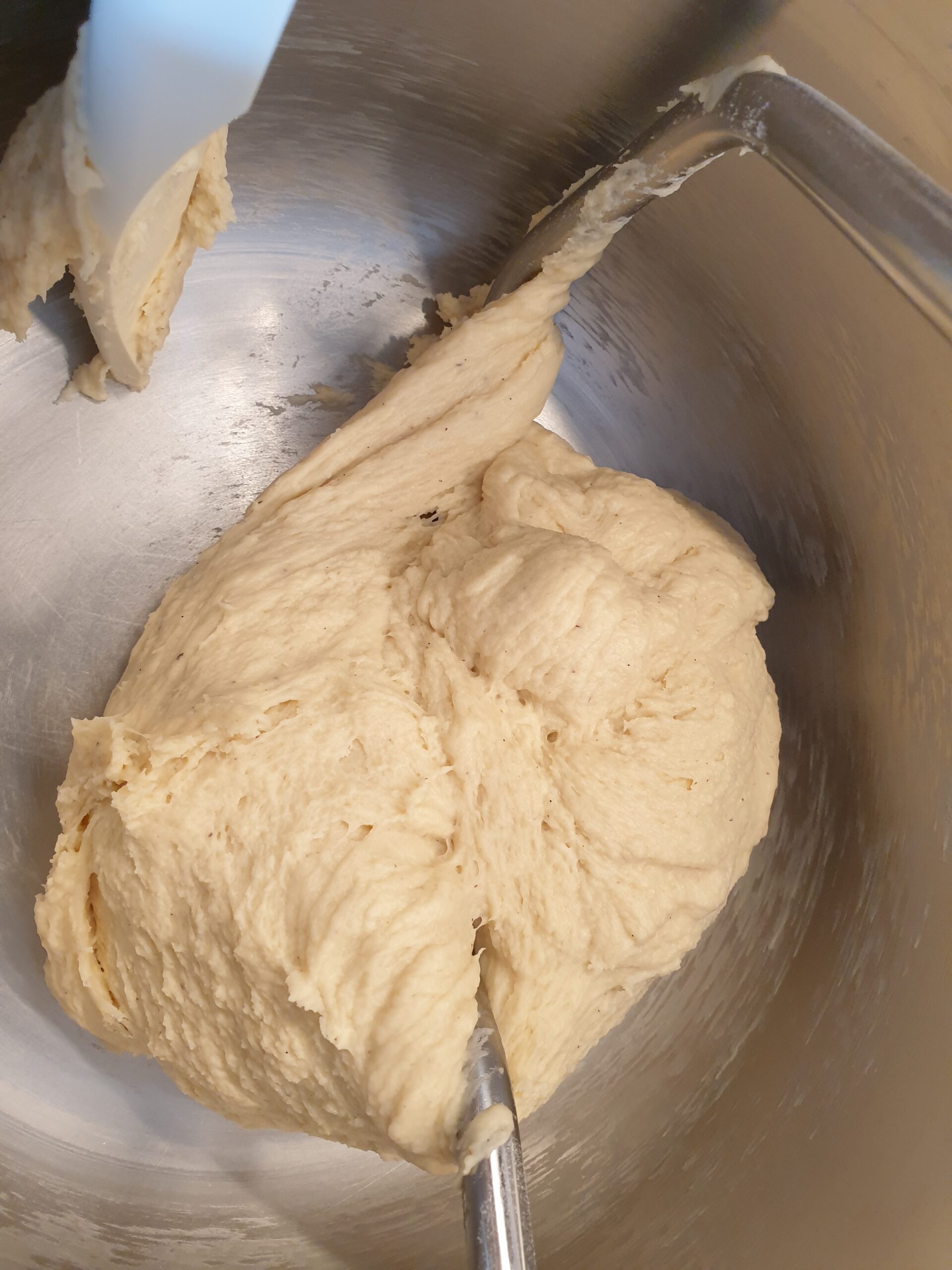 Milch mit der Butter handwarm erwärmen, mit der Hefe vermischen als Vorteig etwas gehen lassen bis er Blasen schlägt (etwa 15 Minuten), dann alle Zutaten mit Knethaken zu einem glatten Teig verarbeiten.