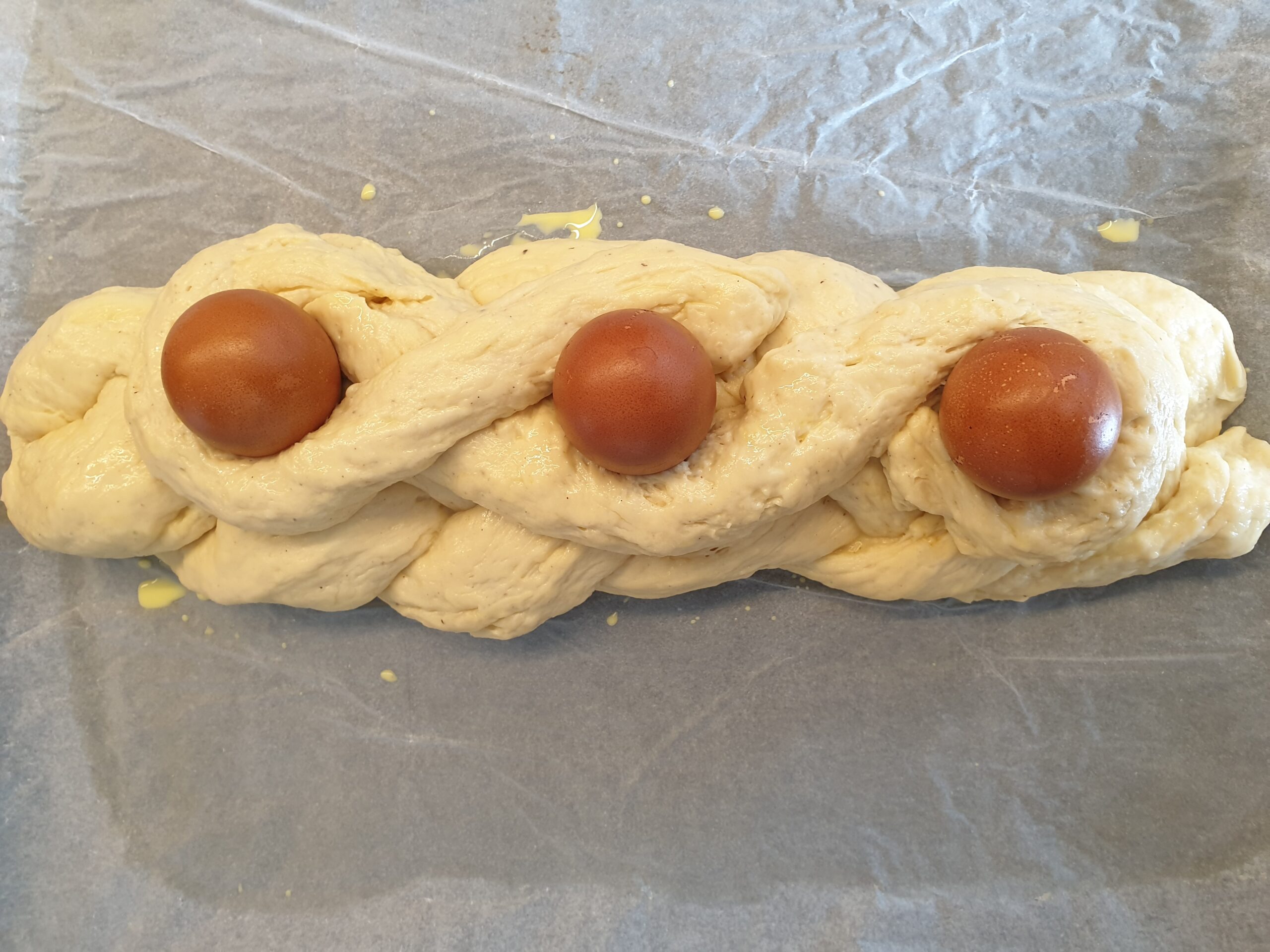 Auf leicht bemehlter Arbeitsfläche den Teig kurz mit der Hand noch einmal durchkneten, in vier gleichgroße Stücke teilen und diese zu etwa 40 cm langen Rollen formen. Aus drei Stücken einen Zopf formen, das vierte Stück wird etwas dünner ausgerollt und in Achten über den Zopf gelegt, um einen Halt für die Eier zu bieten.