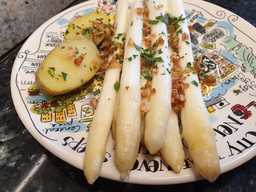 Vegetarische Leckerei mit Spargel, Knoblauch und Kartoffeln, fast der Klassiker …