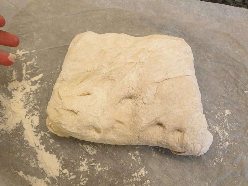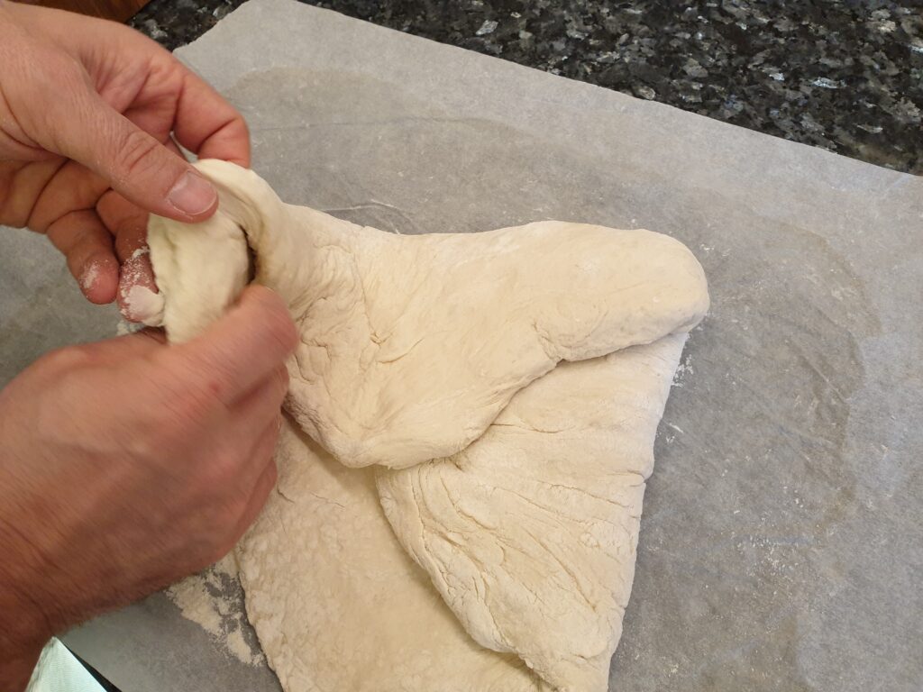 Den Teig nicht zu lange bearbeiten. Eine Kugel formen und mit Mehl bestäuben, mit einem feuchten Tuch abdecken und 20 Minuten gehen lassen. Der Teig verdoppelt sich. Ein Rechteck formen. Den Teig nun noch 1 Stunde gehen lassen und während dieser Zeit den Teig dreimal (alle 20 Minuten einmal) leicht in ein Rechteck drücken und dieses über die Ecken in ein Päckchen falten und umgedreht abgedeckt weiter gehen lassen. Nach dieser Stunde 3 Flûtes formen, dafür den Teig einfach rollen und noch einmal 15 Minuten gehen lassen. Tipp: Das geht auch gut, wenn man die Rollen auf ein bemehltes Küchenhandtuch legt und es zwischen den Rollen in Falten legt. Zum Backen muss dann nur noch einmal auf das Backblech gedreht werden.