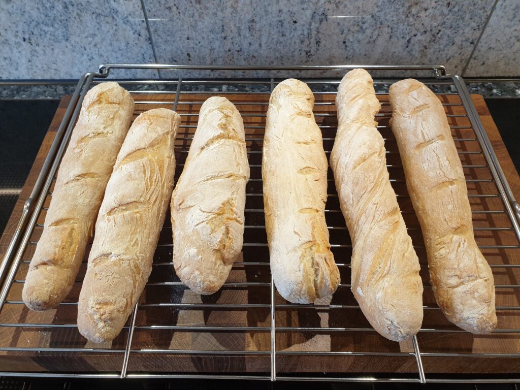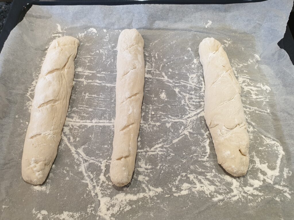 Jede Flûte mehrmals schräg mit einem scharfen Messer einschneiden. Für eine schöne Krustenbildung leicht mit Mehl bestäuben. Nun für etwa 20-25 Minuten bei 220°C oder 230°C (Umluft) backen.