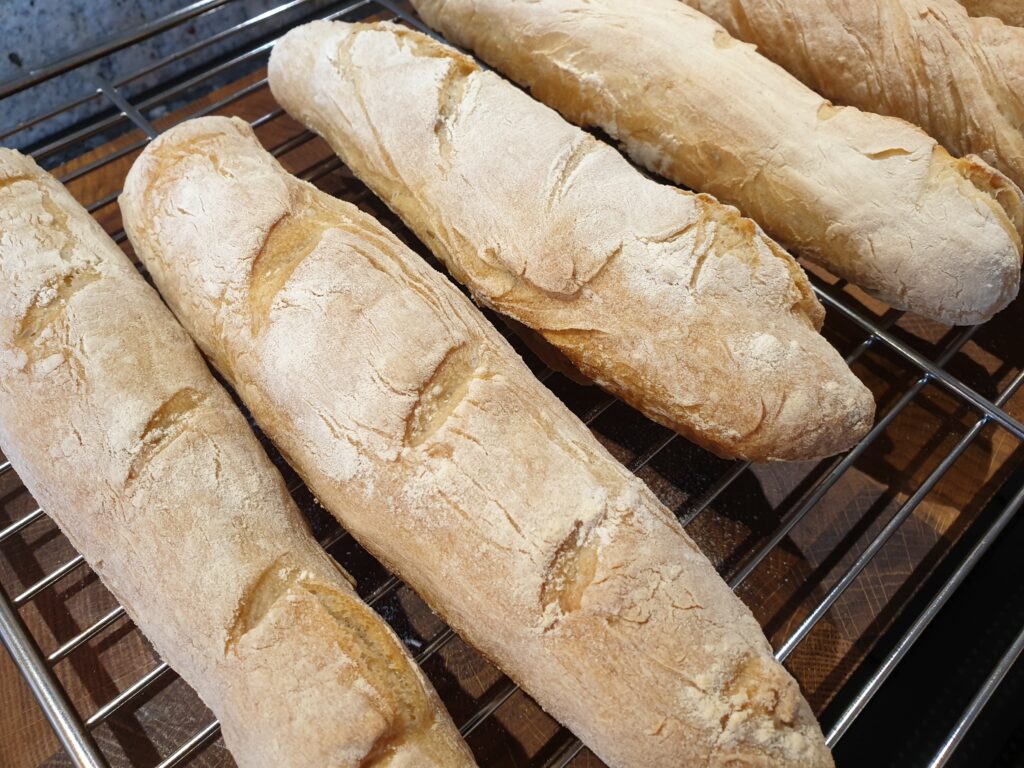 Tipp: Vorgeformte Flûtes können eingefroren werden. Entweder werden die Flûtes 5 Minuten vor Backende aus dem Ofen genommen und nach dem Abkühlen einzeln eingeschlagen eingefroren. Zum Aufbacken lässt man sie auftauen und backt für 10 Minuten auf. Alternativ können Flûtes vor dem Backen und nach dem letzten Gehen direkt eingefroren werden. Für den Verzehr werden die Flûtes dann nach dem Auftauen gebacken wie beschrieben.