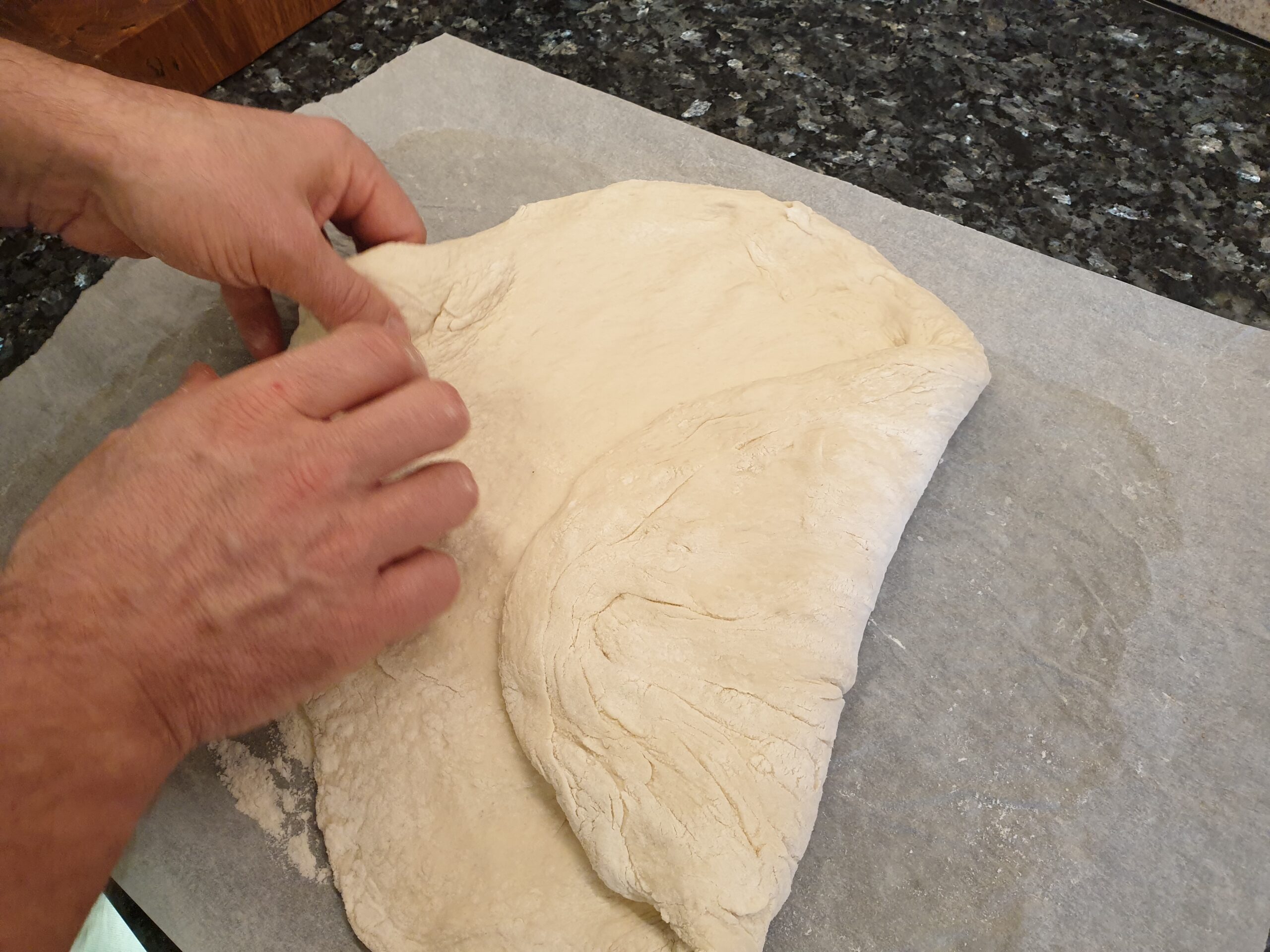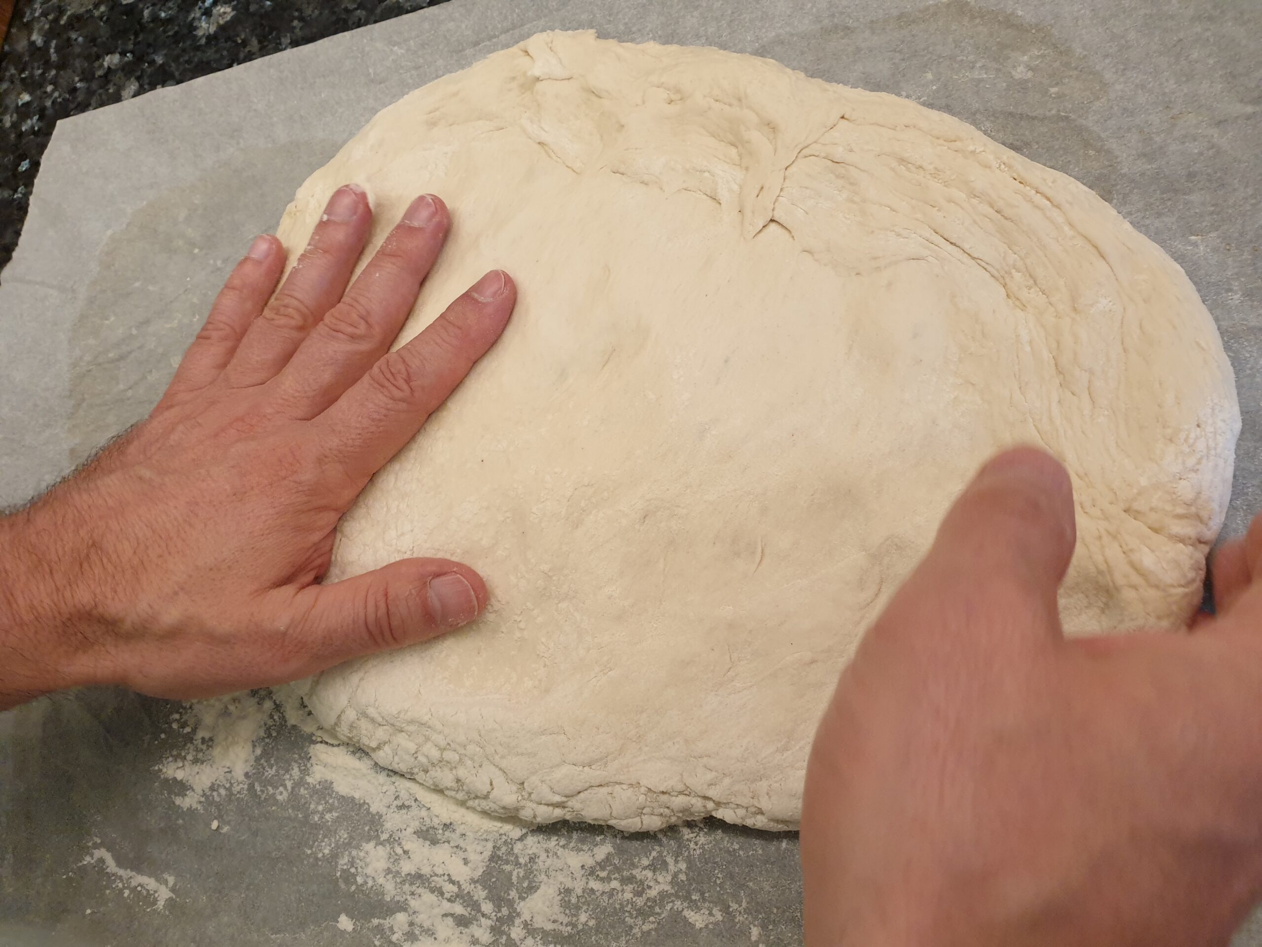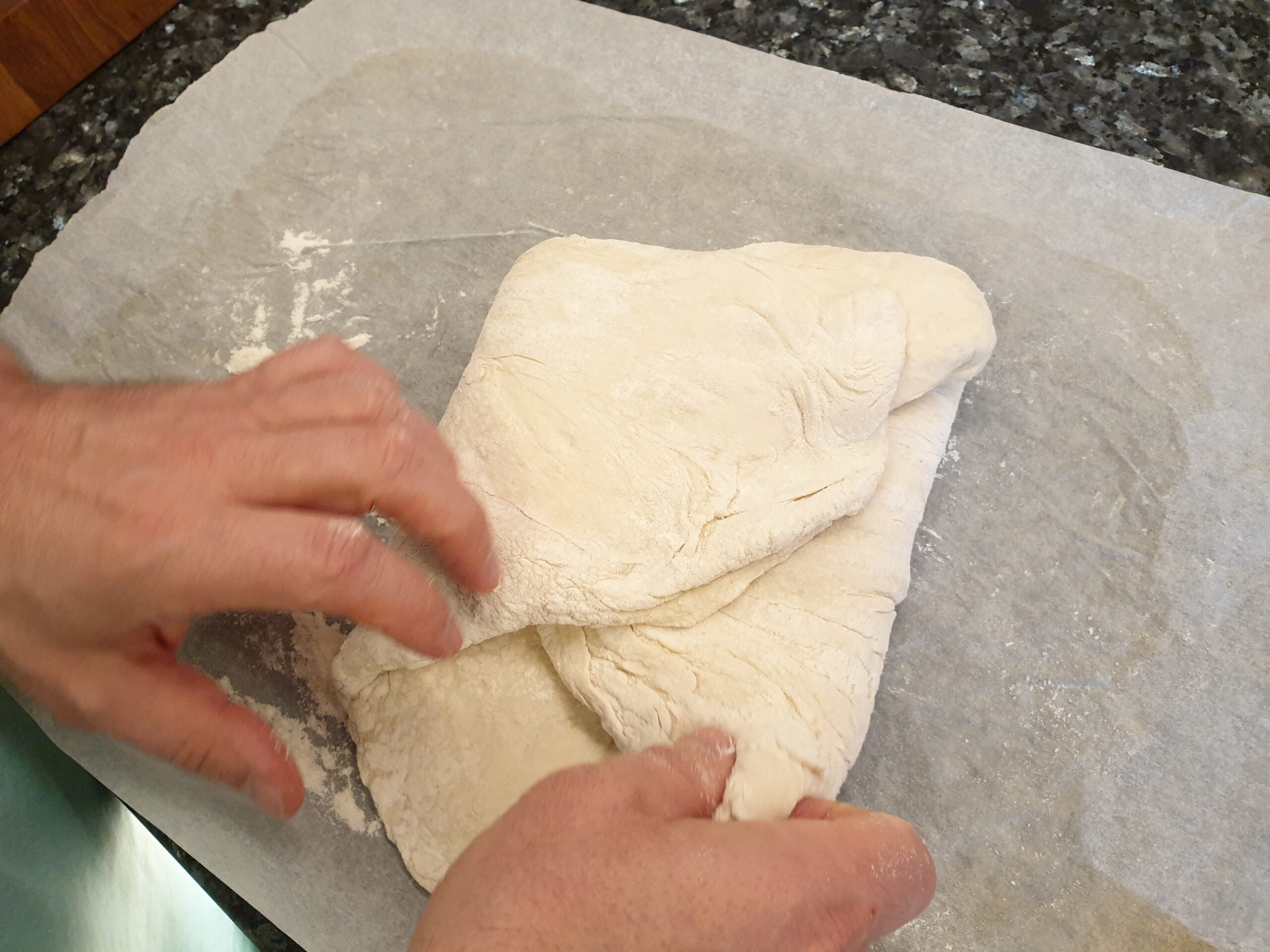 Den Teig nicht zu lange bearbeiten. Eine Kugel formen und mit Mehl bestäuben, mit einem feuchten Tuch abdecken und 20 Minuten gehen lassen. Der Teig verdoppelt sich. Ein Rechteck formen. Den Teig nun noch 1 Stunde gehen lassen und während dieser Zeit den Teig dreimal (alle 20 Minuten einmal) leicht in ein Rechteck drücken und dieses über die Ecken in ein Päckchen falten und umgedreht abgedeckt weiter gehen lassen. Nach dieser Stunde 3 Flûtes formen, dafür den Teig einfach rollen und noch einmal 15 Minuten gehen lassen. Tipp: Das geht auch gut, wenn man die Rollen auf ein bemehltes Küchenhandtuch legt und es zwischen den Rollen in Falten legt. Zum Backen muss dann nur noch einmal auf das Backblech gedreht werden.