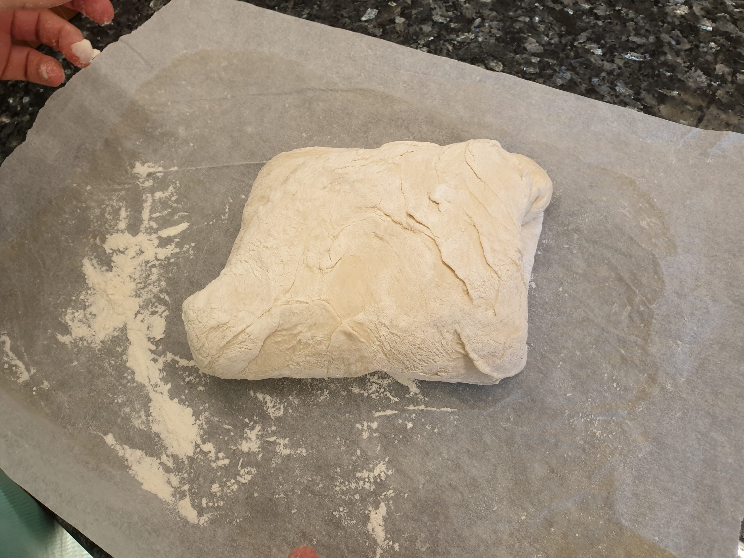Die Hefe im lauwarmen Wasser auflösen. Das Mehl und das Salz zusammen mischen und dann alles mit einem Holzlöffel (sonst ist der Teig zu klebrig) zusammen rühren.