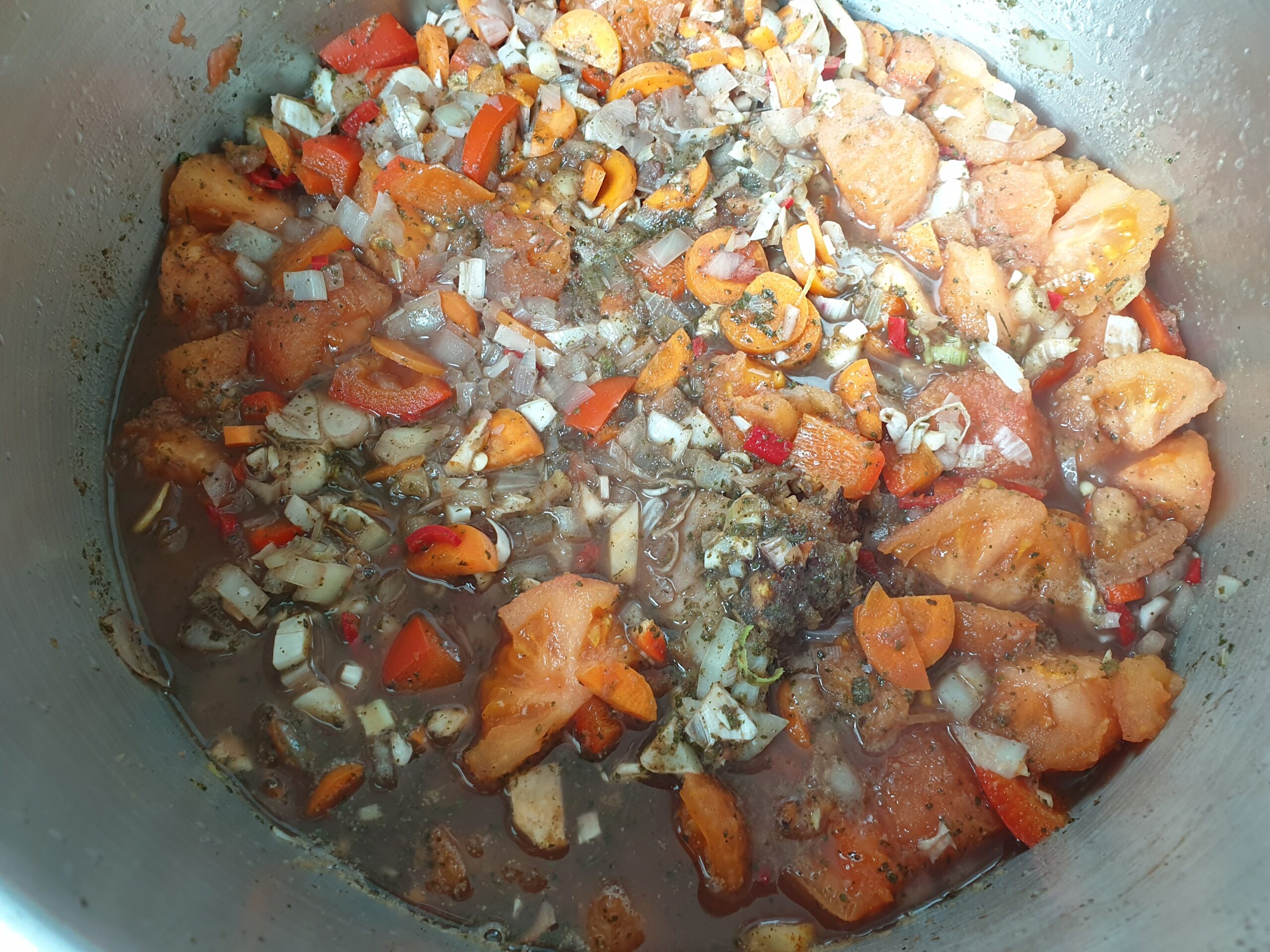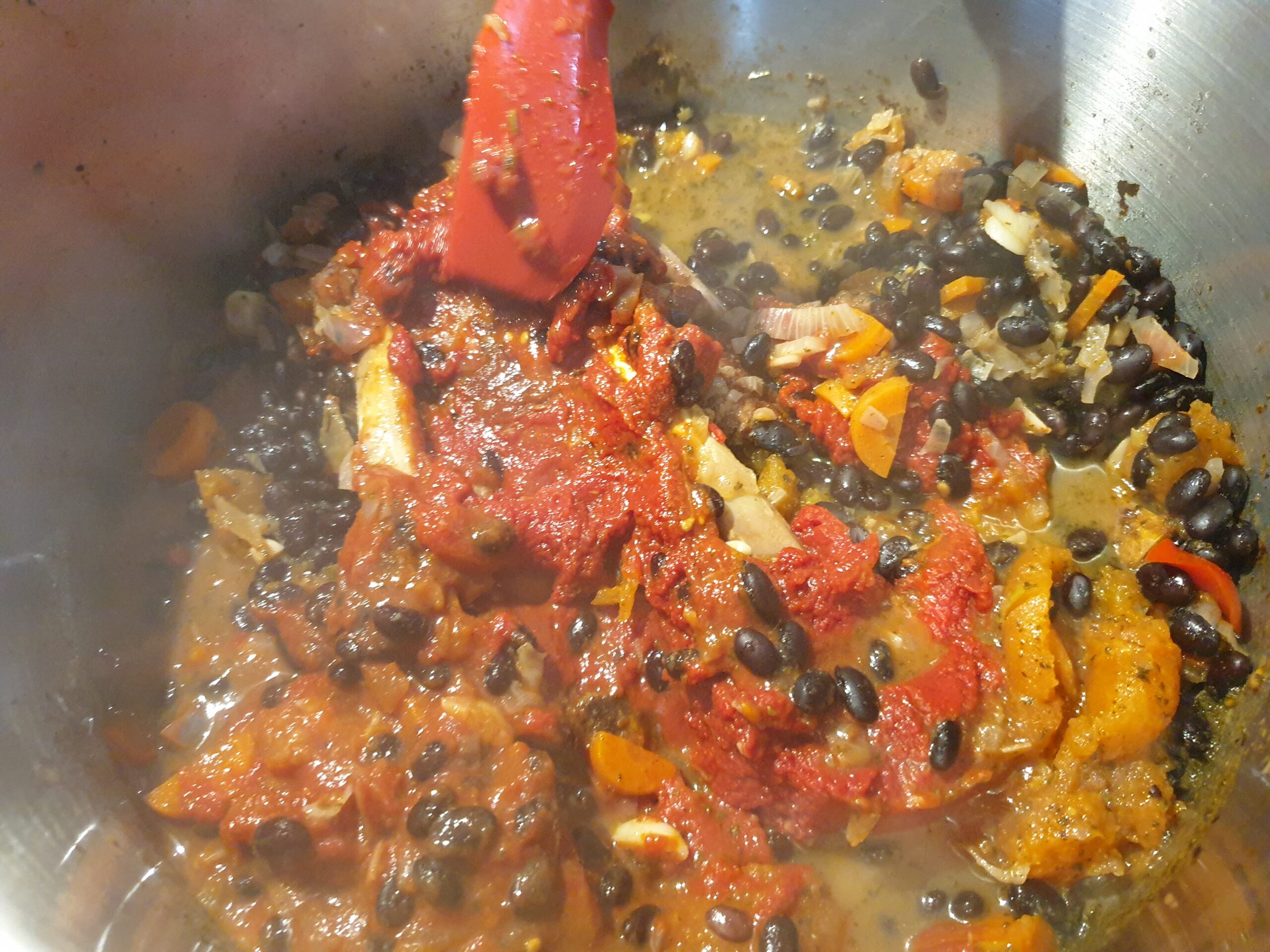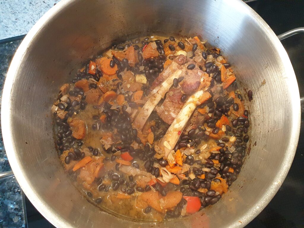 Getrocknete schwarze Bohnen in Salzwasser aufsetzen und langsam vorkochen. Tomaten kreuzweise fein einschneiden, überbrühen und häuten. Alle Gemüsezutaten würfeln oder fein schneiden. Fleisch im hohen Topf mit Olivenöl anbraten. Gemüse hinzugeben, erst die Zwiebeln mit Knoblauch, Chili und Peperoni, dann Möhren und Sellerie, dann die Gewürze und zum Schluss die Tomaten. Mit zwei Glas Rotwein ablöschen und köcheln lassen. Bei 180°C im Ofen 1,5 Stunden garen. Beide Dosen Tomatenmark dazu geben. Die vorgekochten Bohnen abgießen, hinzugeben und eine weitere Stunde im Ofen bis 180°C garen lassen. Fleisch herausnehmen und die Knochen entfernen, sowie klein schneiden und zurück in den Topf geben. Über Nacht stehen lassen und am zweiten Tag noch eine Stunde im Ofen bei 180°C garen lassen.
