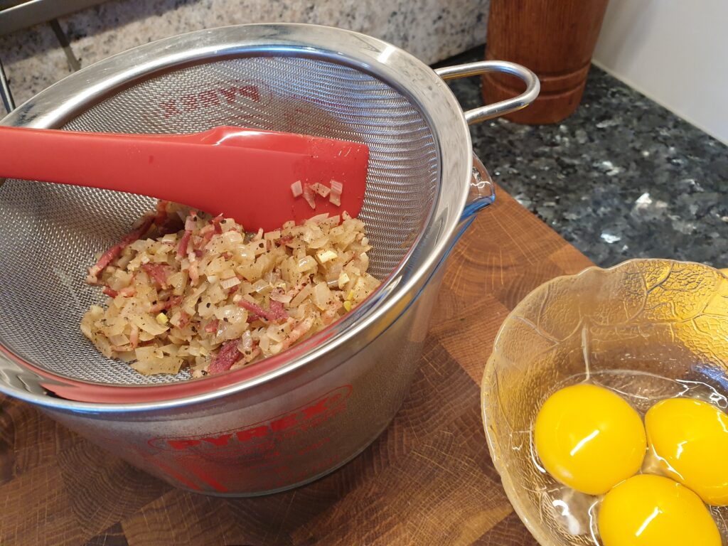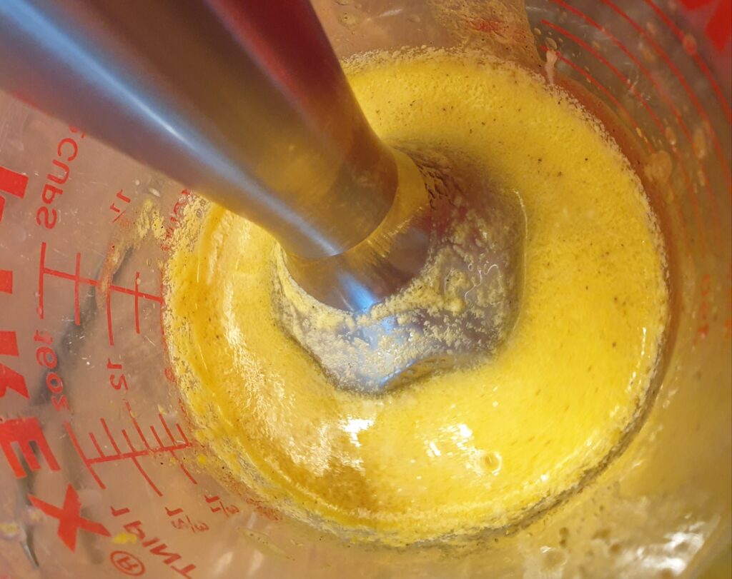 - Ein zusätzliches Eigelb mit einem Teelöffel heißem Wasser während des Pürierens zugeben und weiter pürieren, bis die Masse cremig ist.