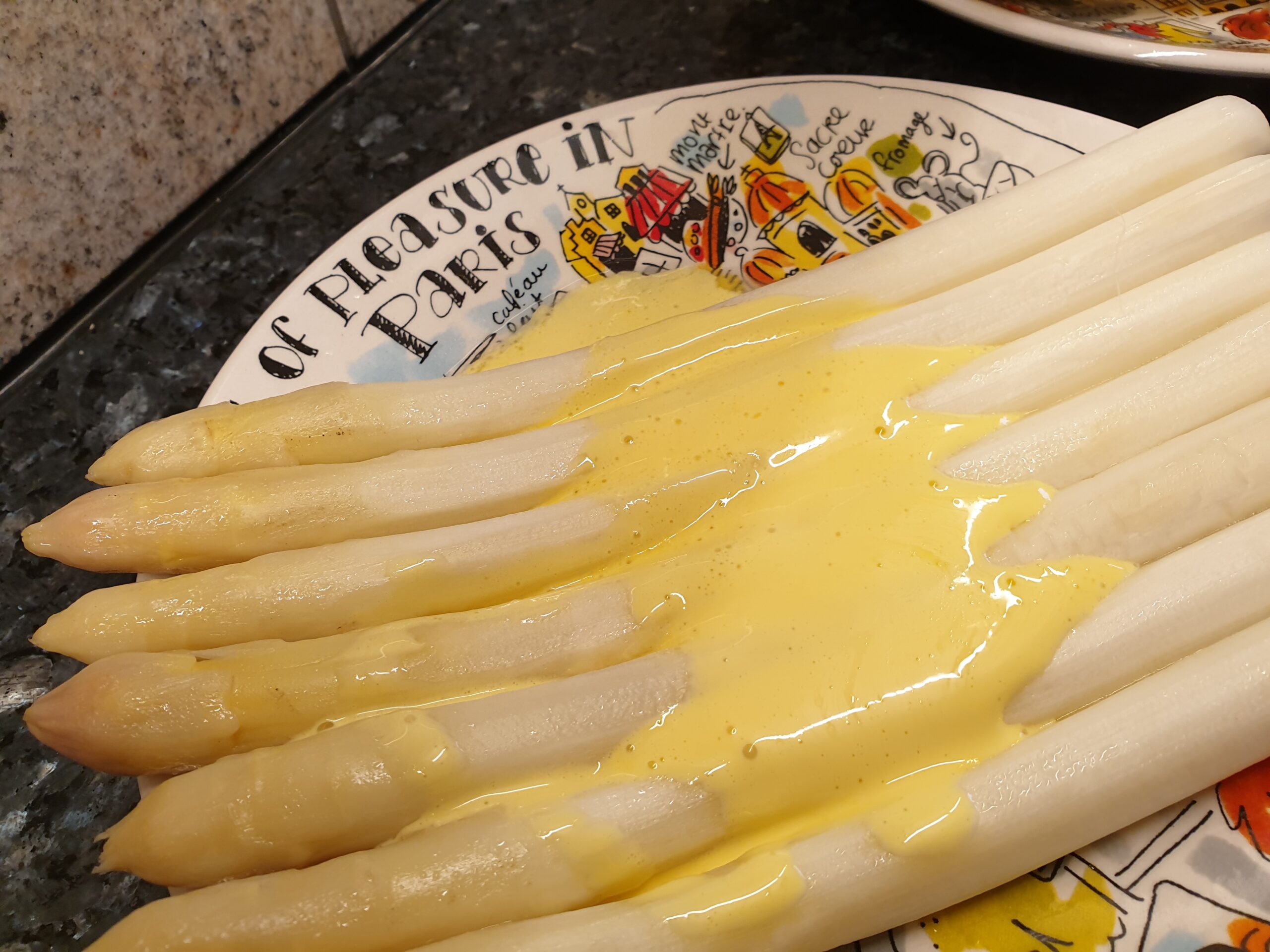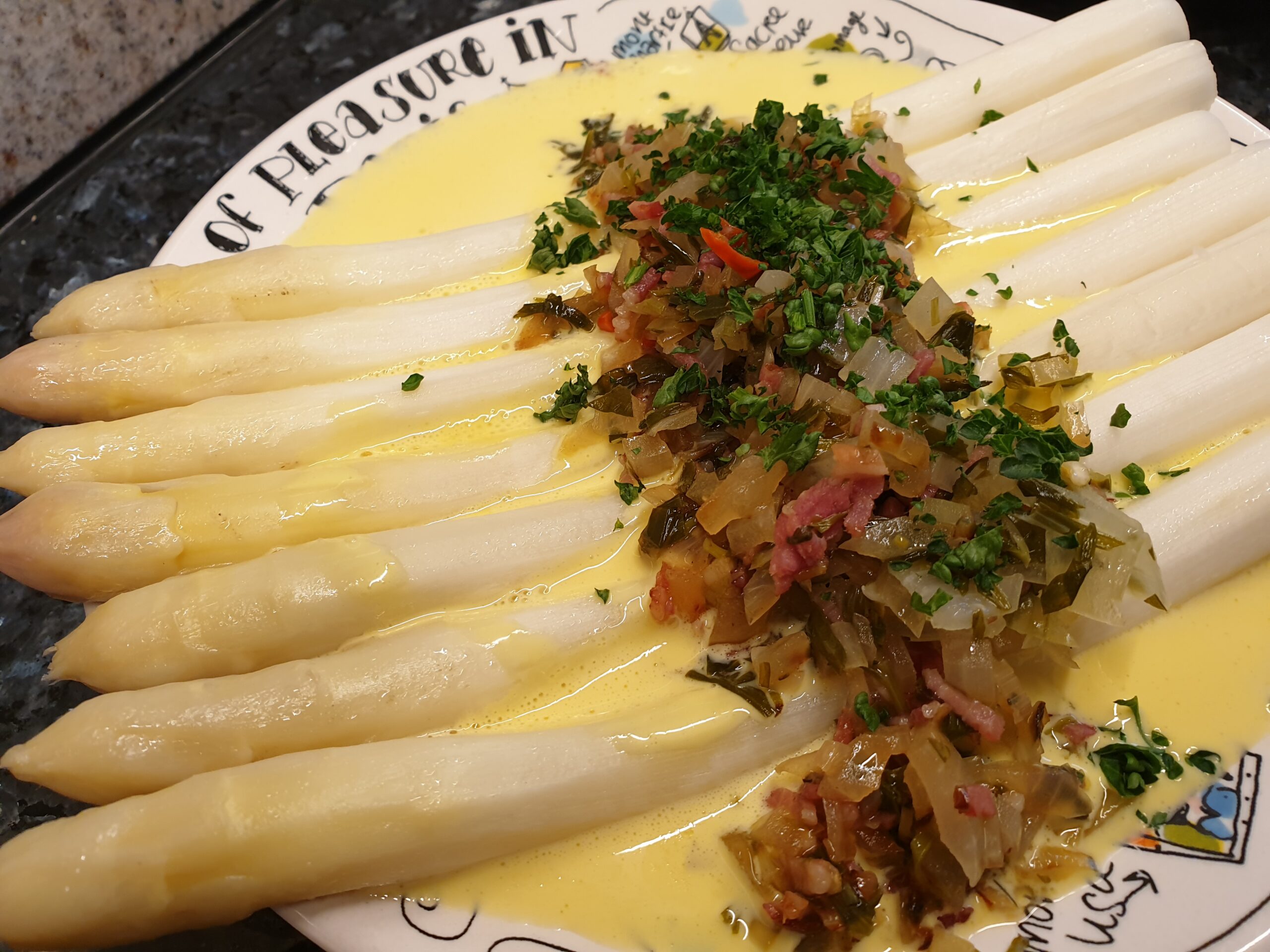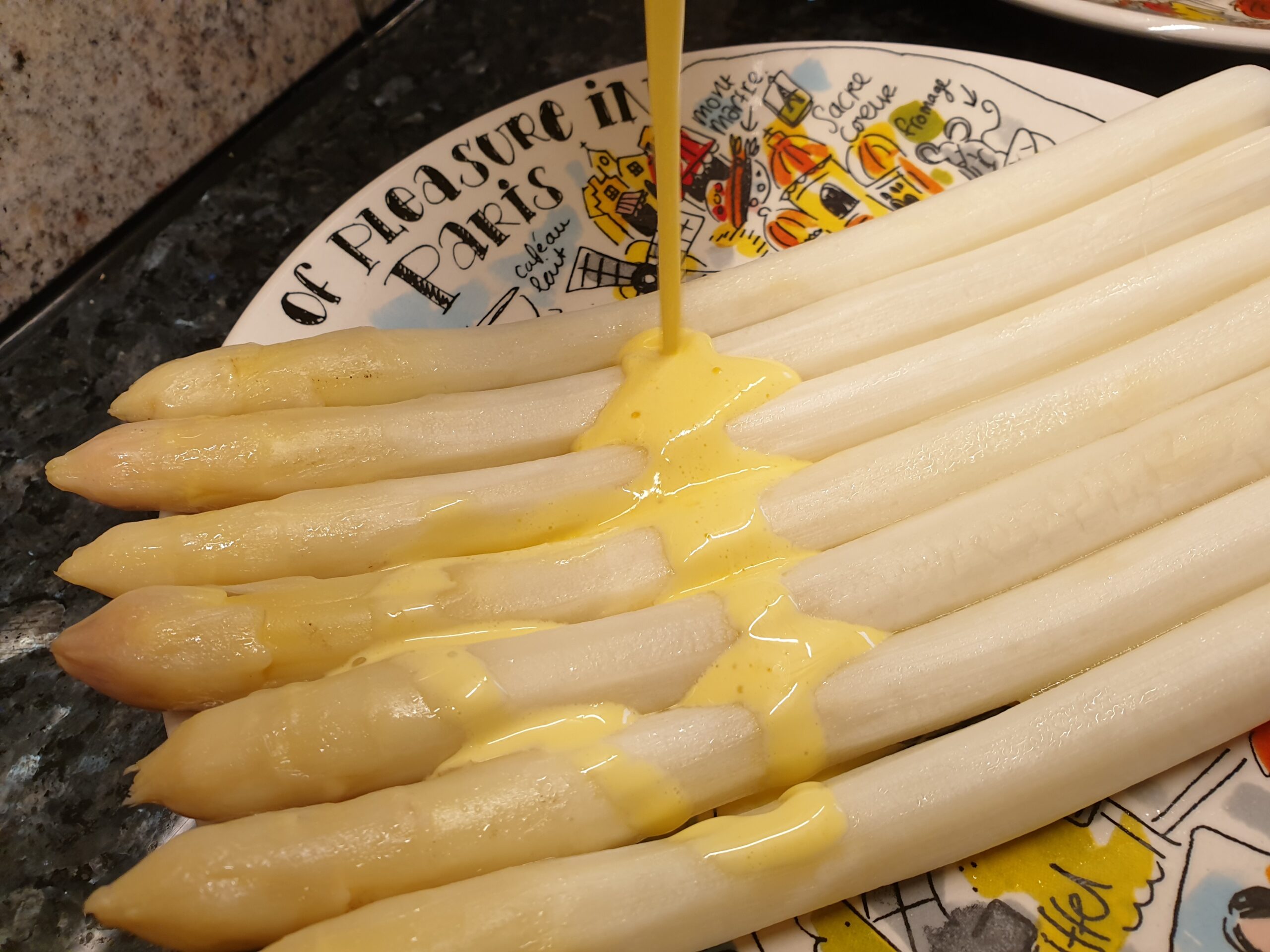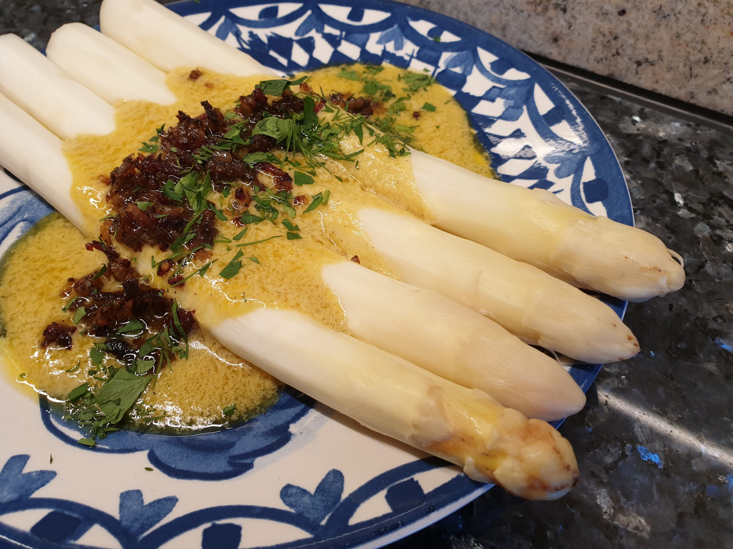 Im Spargelland freuen wir uns über jede Zubereitungsvariante, hier der Klassiker mit einer Sauce Hollandaise, die immer gut zum Spargel passt, und auch zu vielen weiteren Gemüsevarianten, für die sie auch zum Überbacken einsetzbar ist, oder als Beigabe zu Fleischgerichten. Die Zutaten zur Sauce hier sind gedacht für etwa 1 kg Spargel.