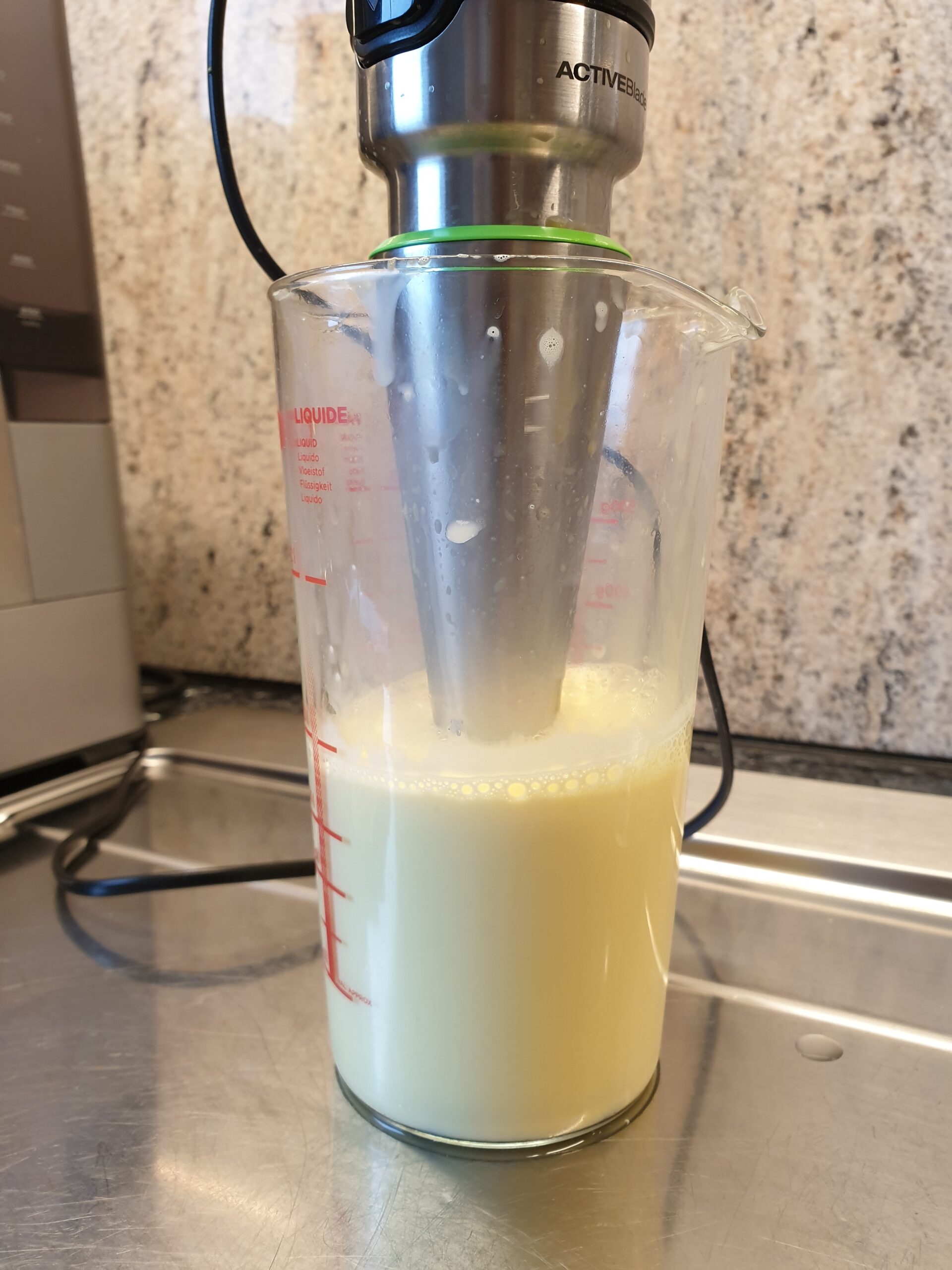 - Ein bis zwei Esslöffel kochend heißes Wasser zugeben und dabei pürieren (Blender oder Prüierstab, beides liefert gute Resultate), bis die Konsistenz stimmt.