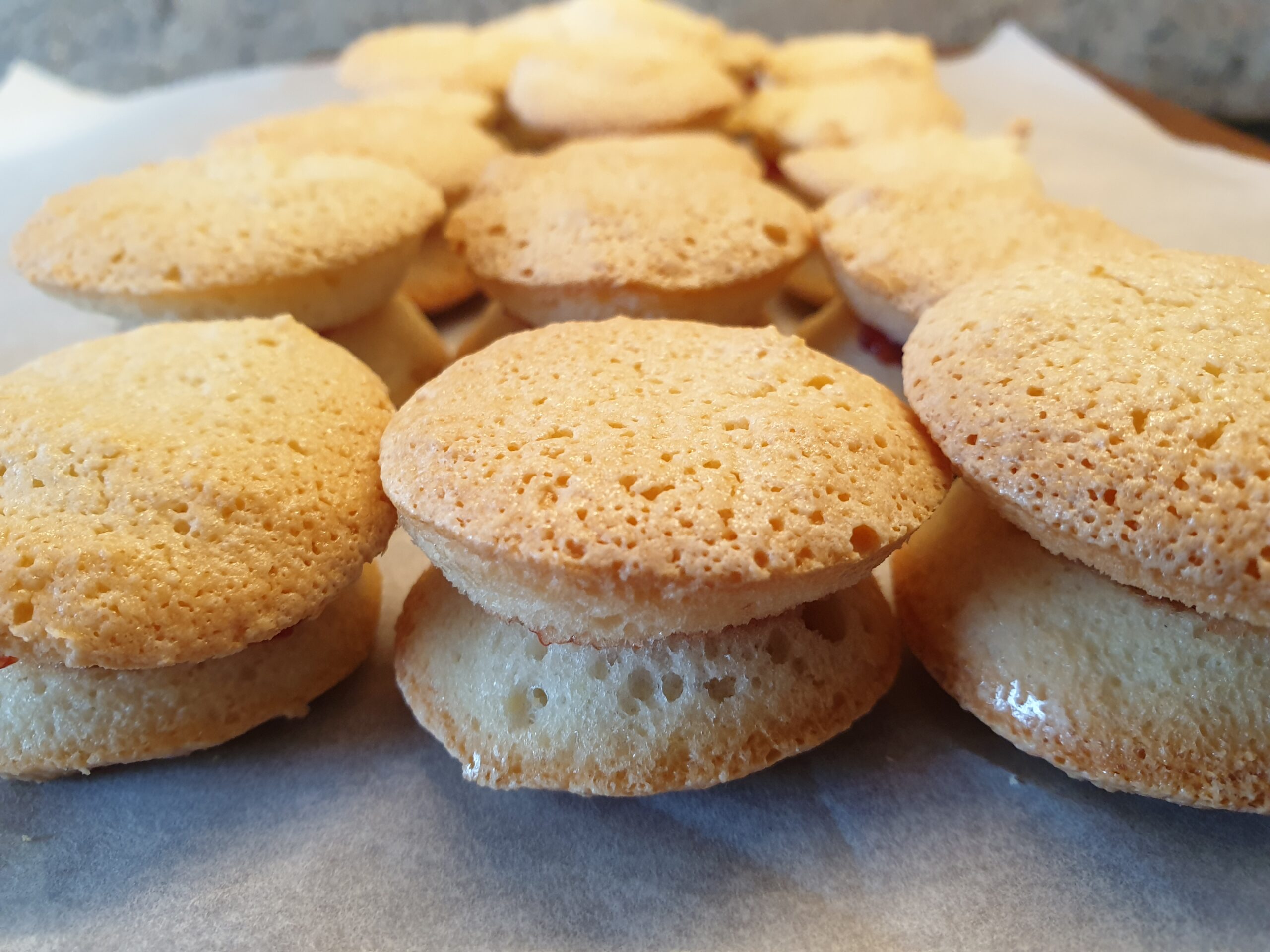 Finish: Etwas Konfitüre auf die Unterseite eines Macarons streichen und ein zweites Macaron mit der Unterseite dagegen setzen. Genießen!
