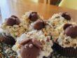 Eiklar schlagen, bis die Masse steife, glänzende Spitzen sieht, den Zucker dabei nach und nach einrieseln lassen. Mandeln und Zimt auf den Eischnee geben und mit einem Schneebesen vorsichtig unterheben. Mit Hilfe von zwei Teelöffeln kleine Häufchen auf das Backtrennpapier setzen – wer mag, kann die Häufchen mit einer Mandel verzieren. Im vorgeheizten Backofen bei 150°C etwa 15 Minuten backen. Macarons auf ein Gitter zum Abkühlen setzen.