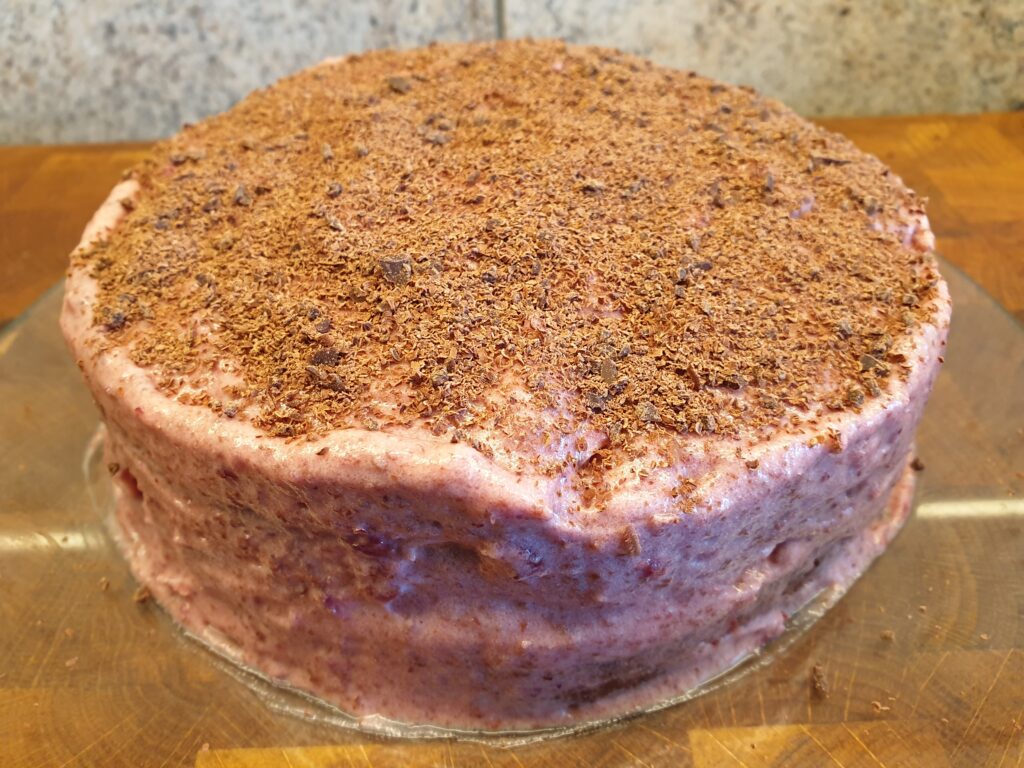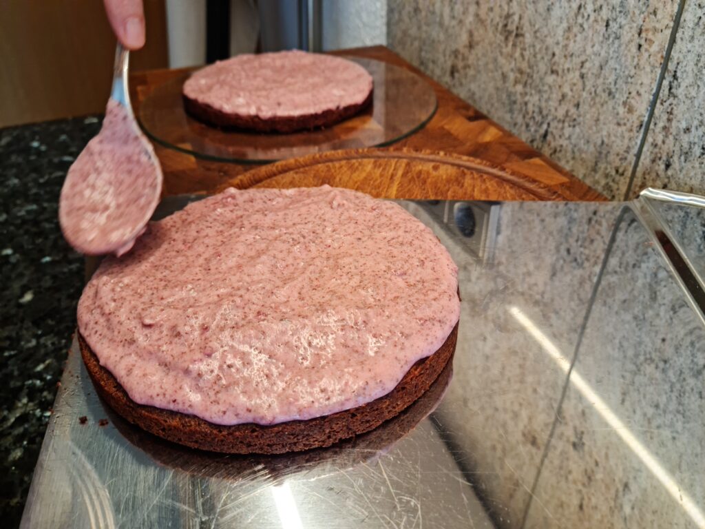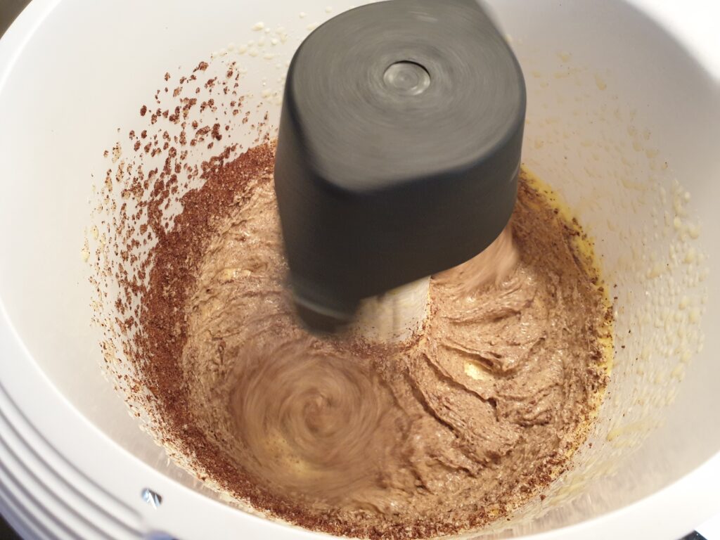 Butter mit dem Zucker schaumig rühren, Eigelb dazu geben und schaumig rühren. Haselnüsse, Kakao und Backpulver unter die Schaummasse rühren, dabei sollte der Kakao nicht klumpen. Das Eiweiß zu steifem Schnee schlagen und vorsichtig unterheben. In eine runde Kuchenform füllen und glätten. 30 Minuten bei 175°C backen, anschließend abkühlen lassen.