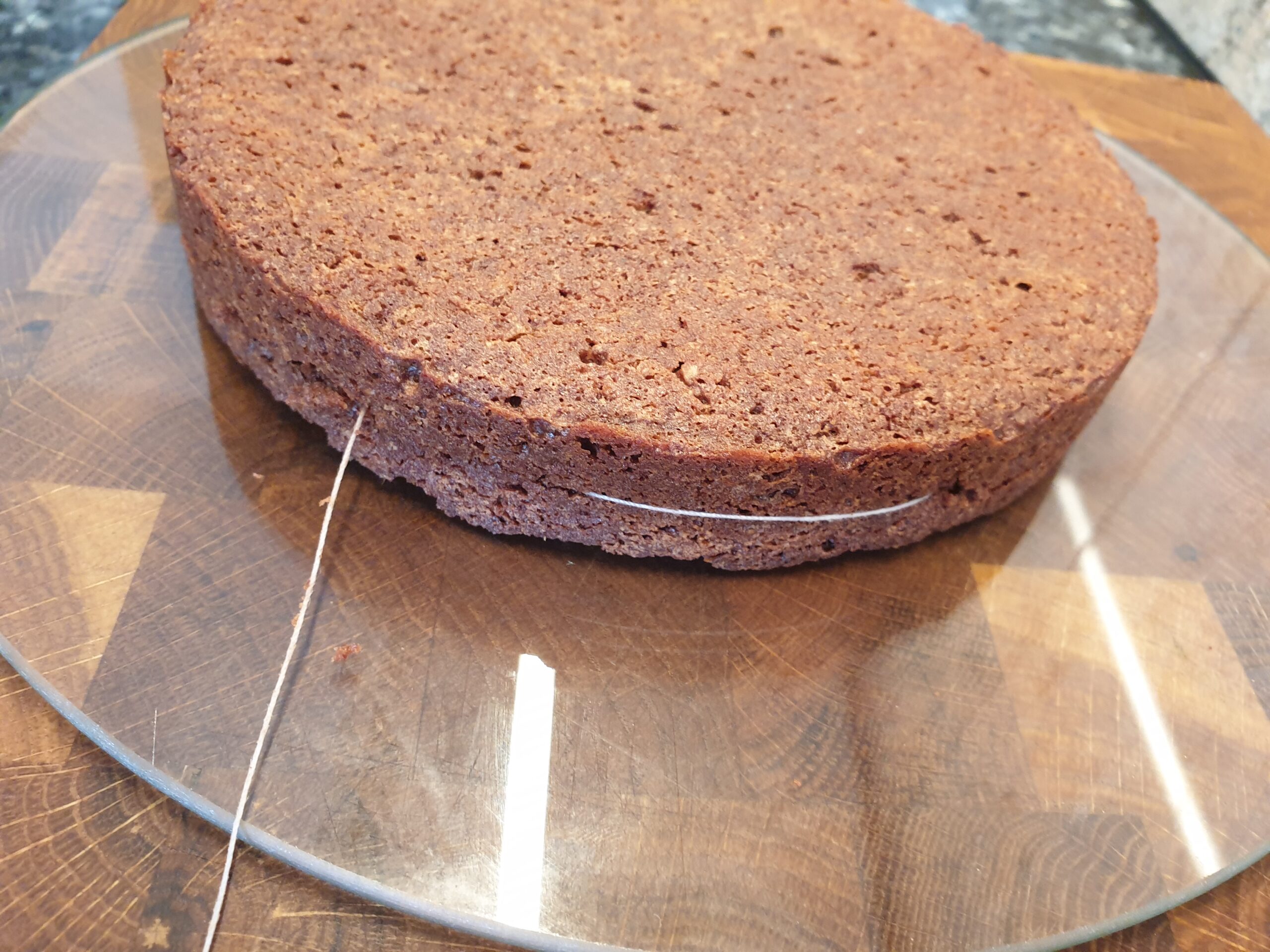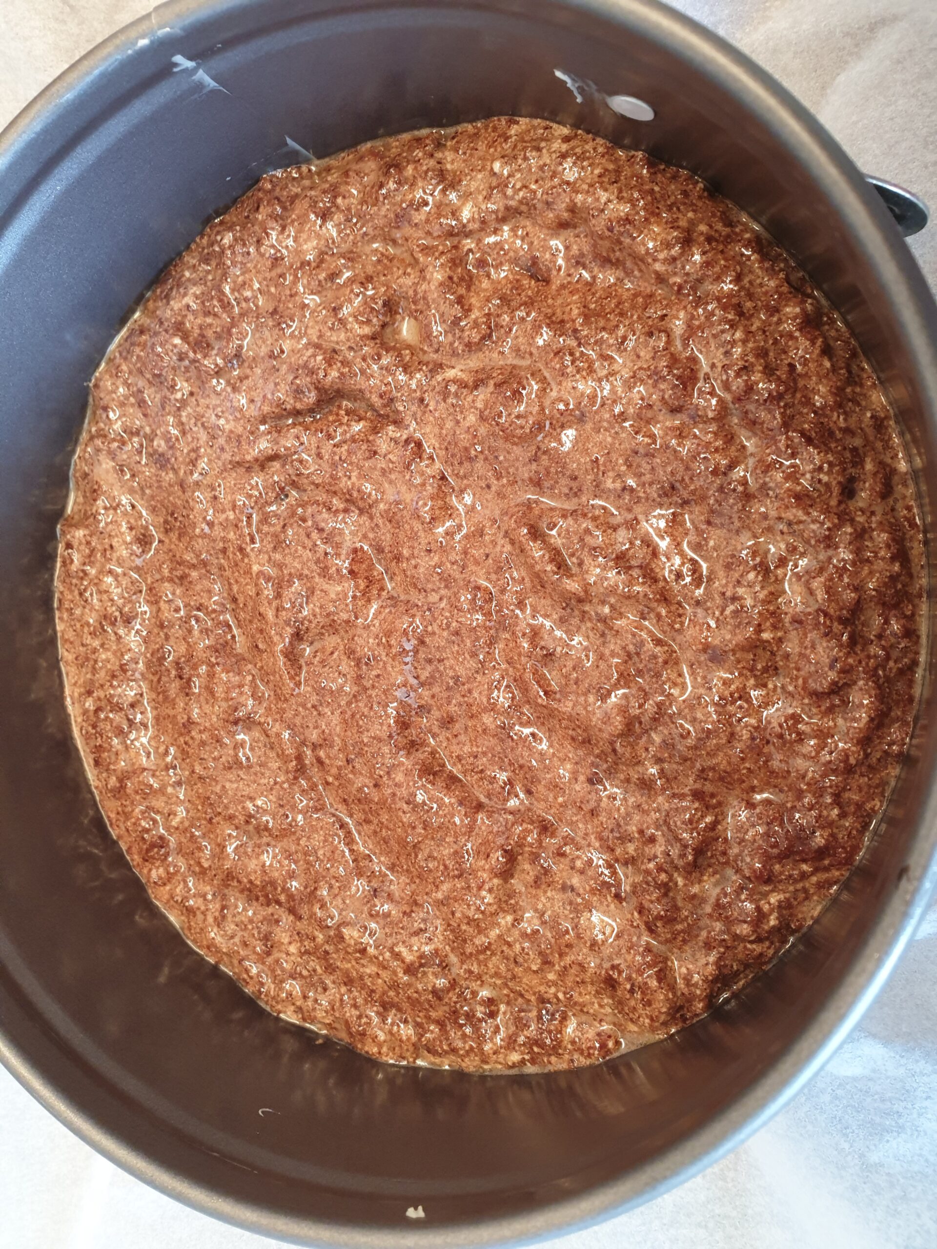 Butter mit dem Zucker schaumig rühren, Eigelb dazu geben und schaumig rühren. Haselnüsse, Kakao und Backpulver unter die Schaummasse rühren, dabei sollte der Kakao nicht klumpen. Das Eiweiß zu steifem Schnee schlagen und vorsichtig unterheben. In eine runde Kuchenform füllen und glätten. 30 Minuten bei 175°C backen, anschließend abkühlen lassen.