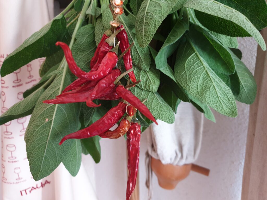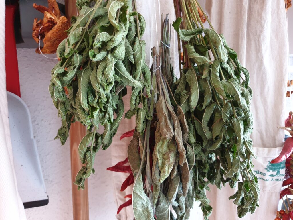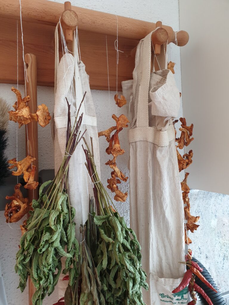Pilze und Kräuter schmecken gut getrocknet intensiver als eingefroren und sind eine leckere Würzzugabe für den Winter. Zuvor leicht putzen abder nicht waschen. Am Besten trocknet man im Schatten, ideal ist die Küche, wenn es im Sommer warm und die Luft trocken ist. Kräuter werden in Sträuße gebunden und kopfüber aufgehängt. Die Trocknung dauert zwei bis drei Wochen, je nach Kraut. Beifuß ist ein gutes Würzkraut für den Gänsebraten, Salbei zu Fleischgerichten, Pfefferminze zu Joghurtsaucen. Im Bild sind Pfefferminze und Salbeisträußchen zu sehen. Pilze und Chili werden auf Zwirn aufgefädelt und hängen die Ketten aufgehängt.