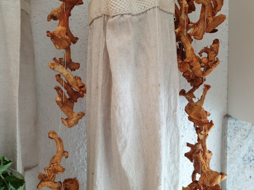 Im Bild unten sind Pfifferlinge im Ganzen aufgefädelt. Steinpilze schneidet man eher blättrig vor dem Auffädeln oder besser dem Dörren, damit sie gut durchtrocknen können.