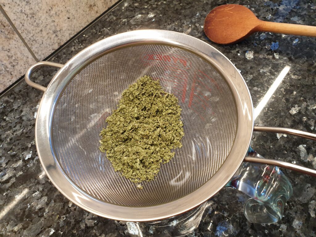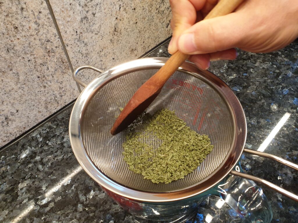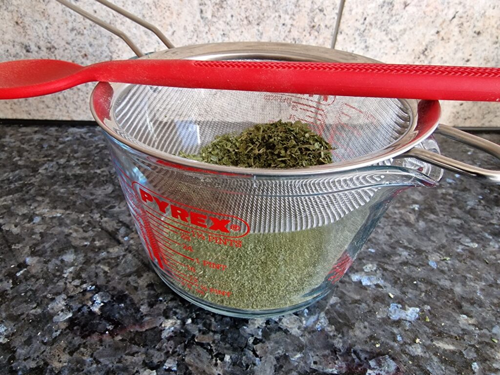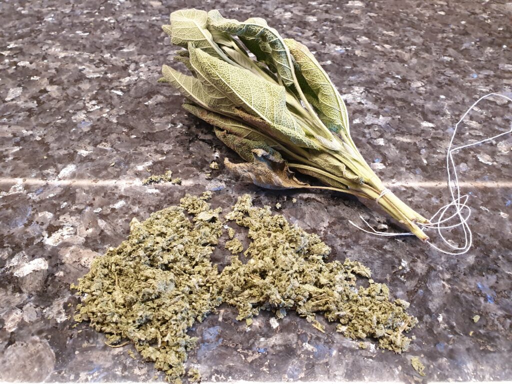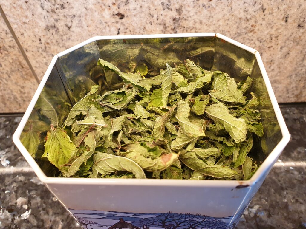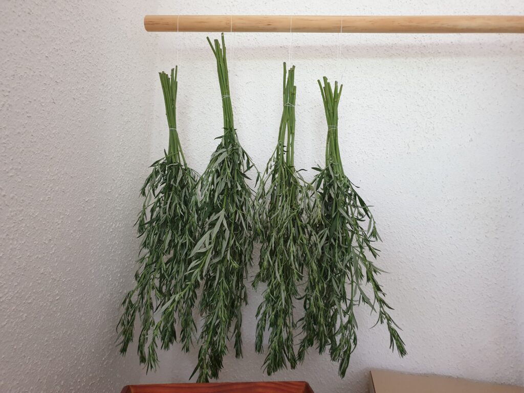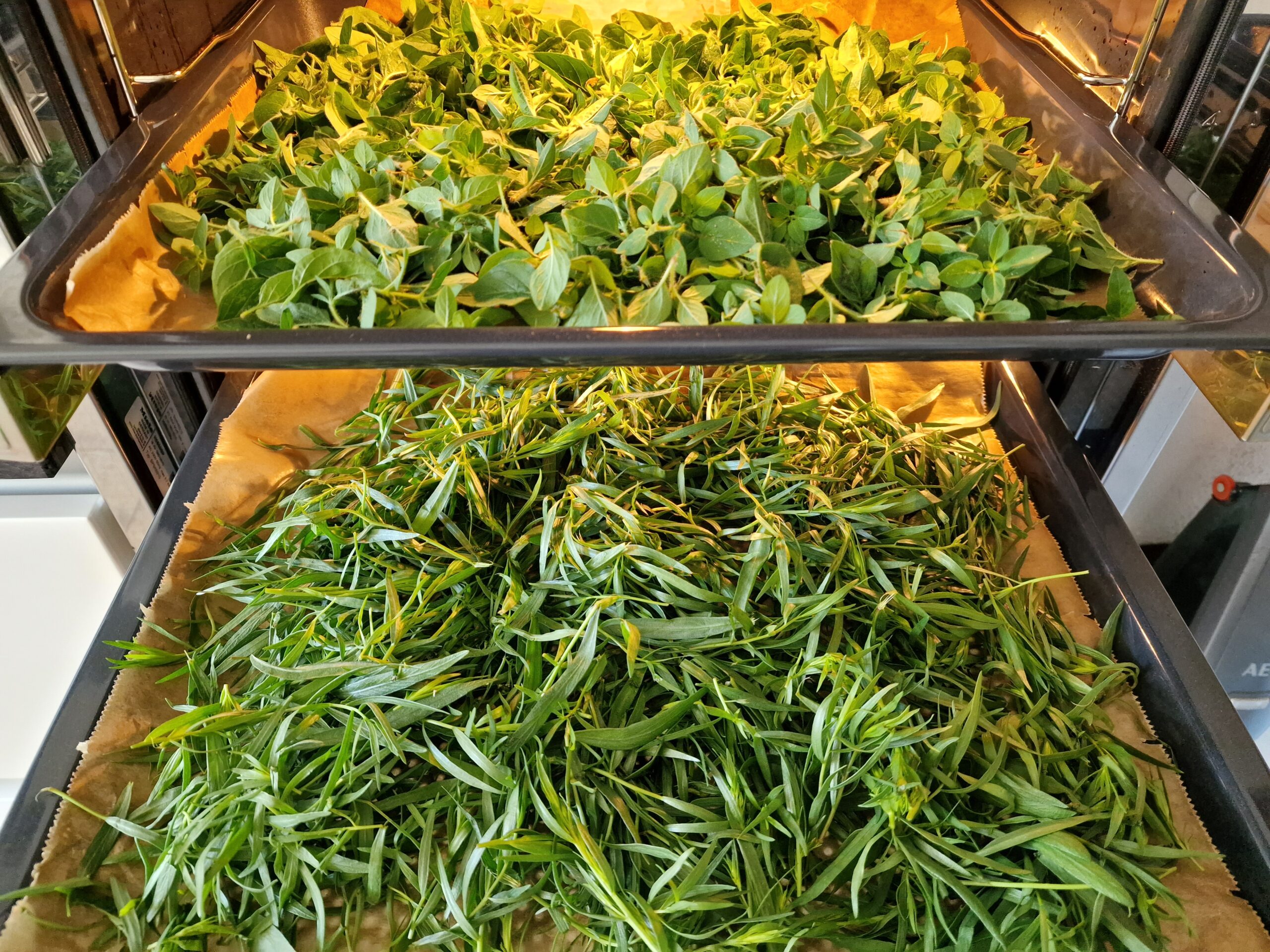 Nach dem Trocknen werden die Blätter der Kräuter abgestreift. Pfefferminze kann man als Blättchen von Stielen abgestreift am besten im Ganzen aufbewahren, das hält das Pfefferminze im Blatt und intensiviert den Geschmack der Pfefferminze. Diese wird erst frisch vor Verbrauch durch ein Sieb gerieben. Salbei wird nach dem Trocknen fein gerieben und durch ein Sieb gegeben, das ergibt ein feines Würzpulver zum Aufbewahren. Estragon oder Oregano wird nach der Ernte in Blättchen im Ofen bei 40°C für mindestens 6-8 Stunden getrocknet um den natürlichen Trocknungsvorgang an der Sonne nachzuahmen. Dann werden die trockenen Blättchen grob zerrieben in einem braunen Glas oder im Dunklen aufbewahrt. Alternativ können diese Kräuter auch in Sträußen an der Luft auf natürliche Weise mehrere Wochen trocknen.